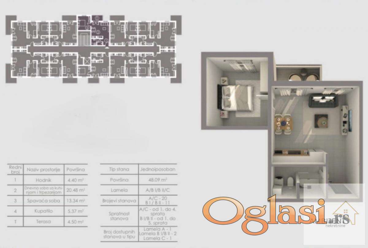 Ima 48m2 i čine ga dnevna soba sa kuhinjom i trpezarijom,spavaća soba, kupatilo i terasa.