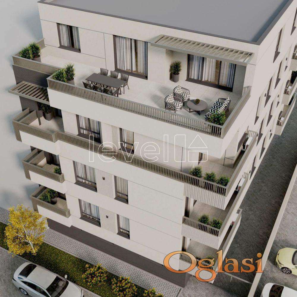 novogradnji sa rokom završetka jesen 2027.god. na Telepu. Drugi sprat, lift, terasa,