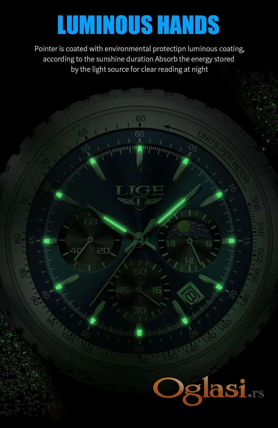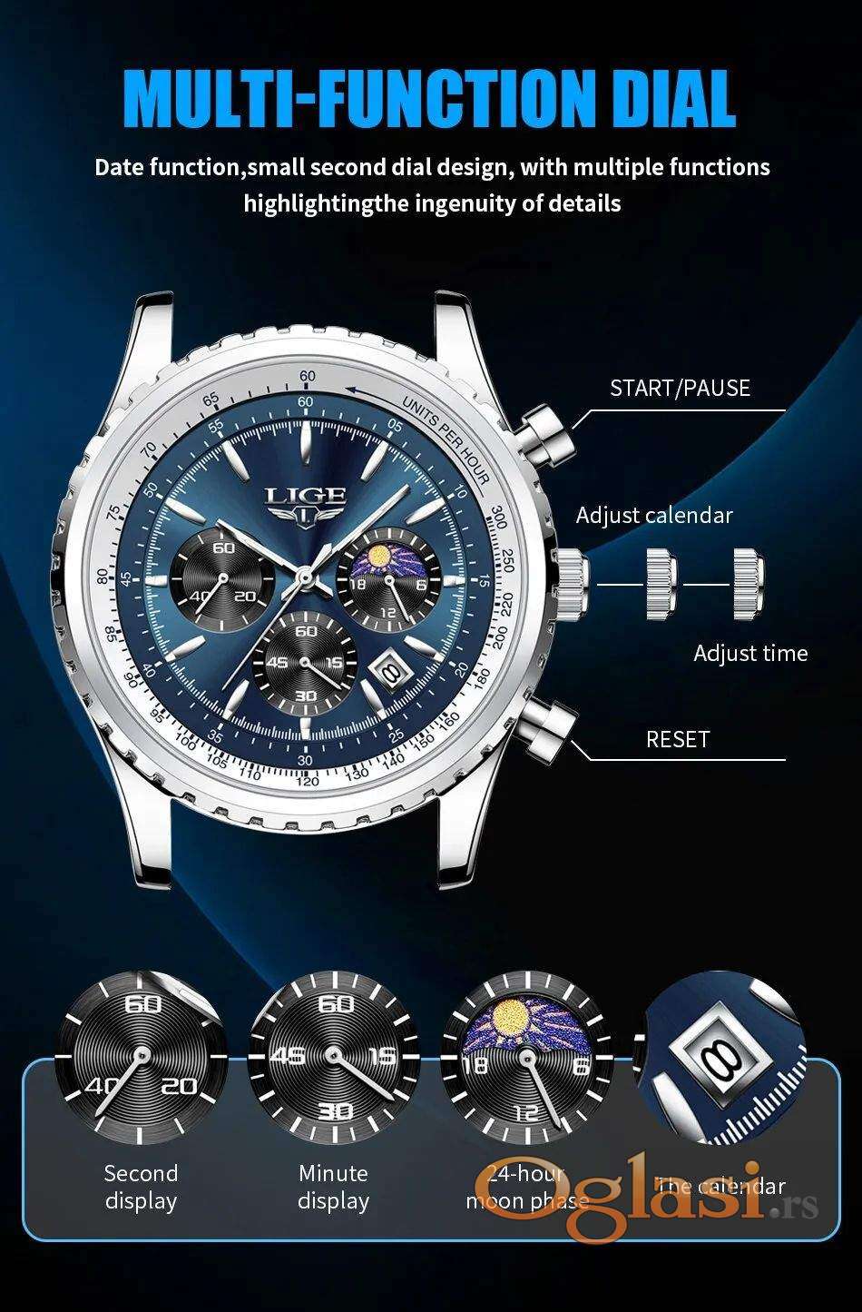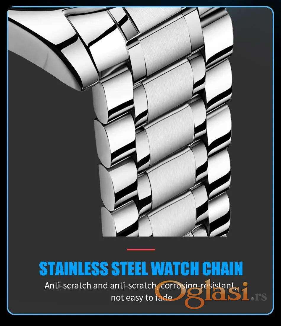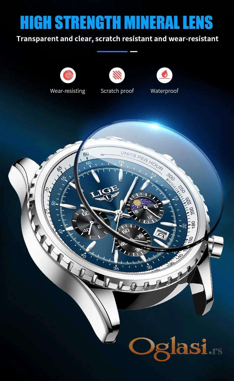 Premijum kvalitet sa hronometrom (sve kazaljke u funkciji), datumom, mineralnim staklom otpornim na ogrebotine i kvalitetnom metalnom narukvicom.