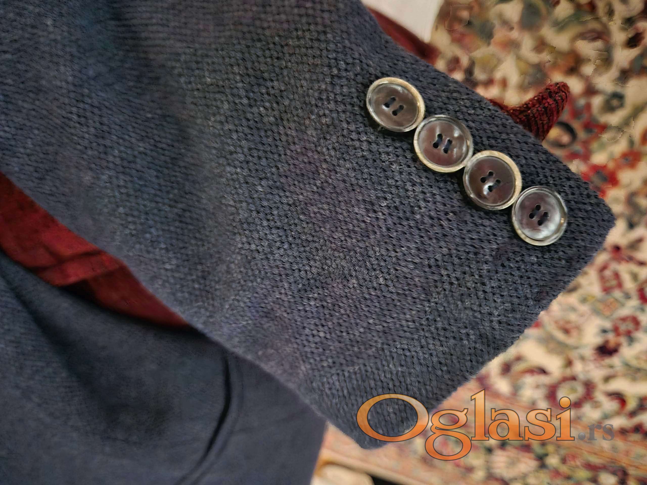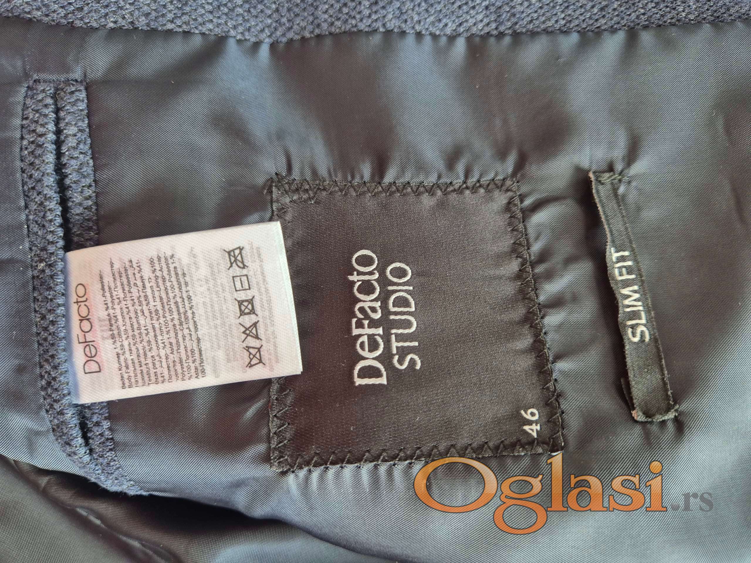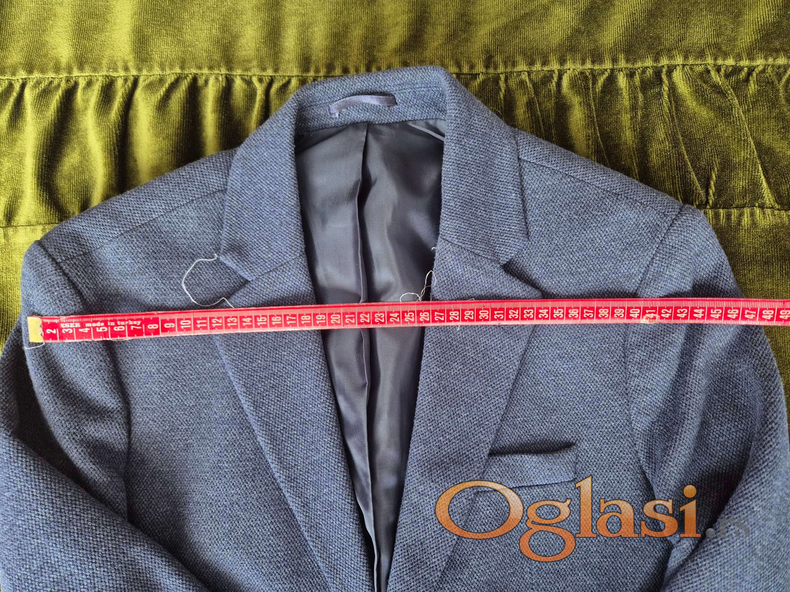Sako modro plave boje, od štofa, mešavina pamuk-poliester, v.46, za vitke muškarce/dečake (SLIM FIT). Nošen je samo jedanput na maloj maturi, dakle, kao nov (dečak od 14 god.je nosio na proslavi svoje mature). Najrealniji prikaz boje je na slici rukava.