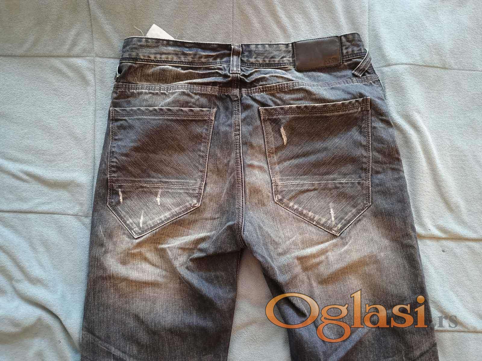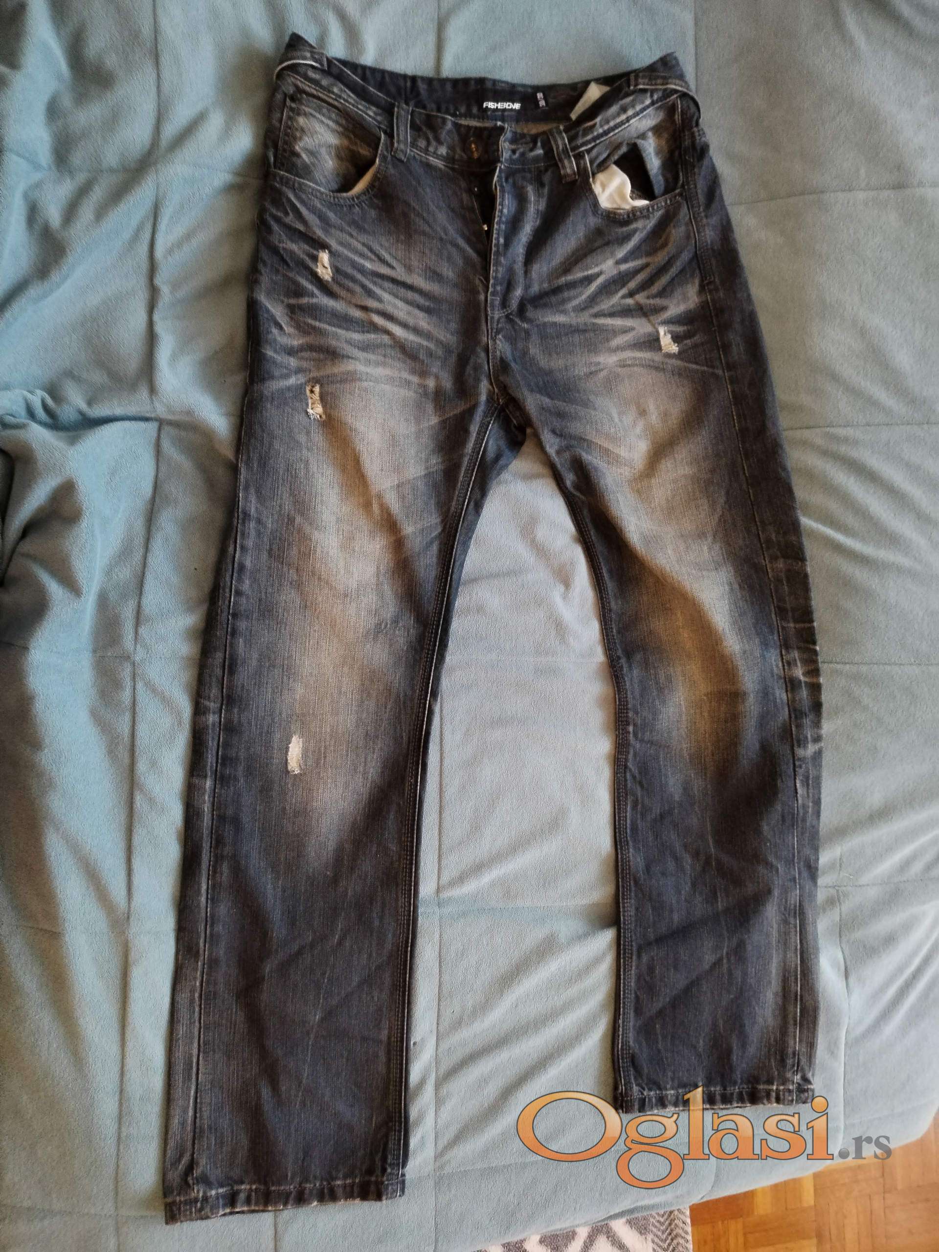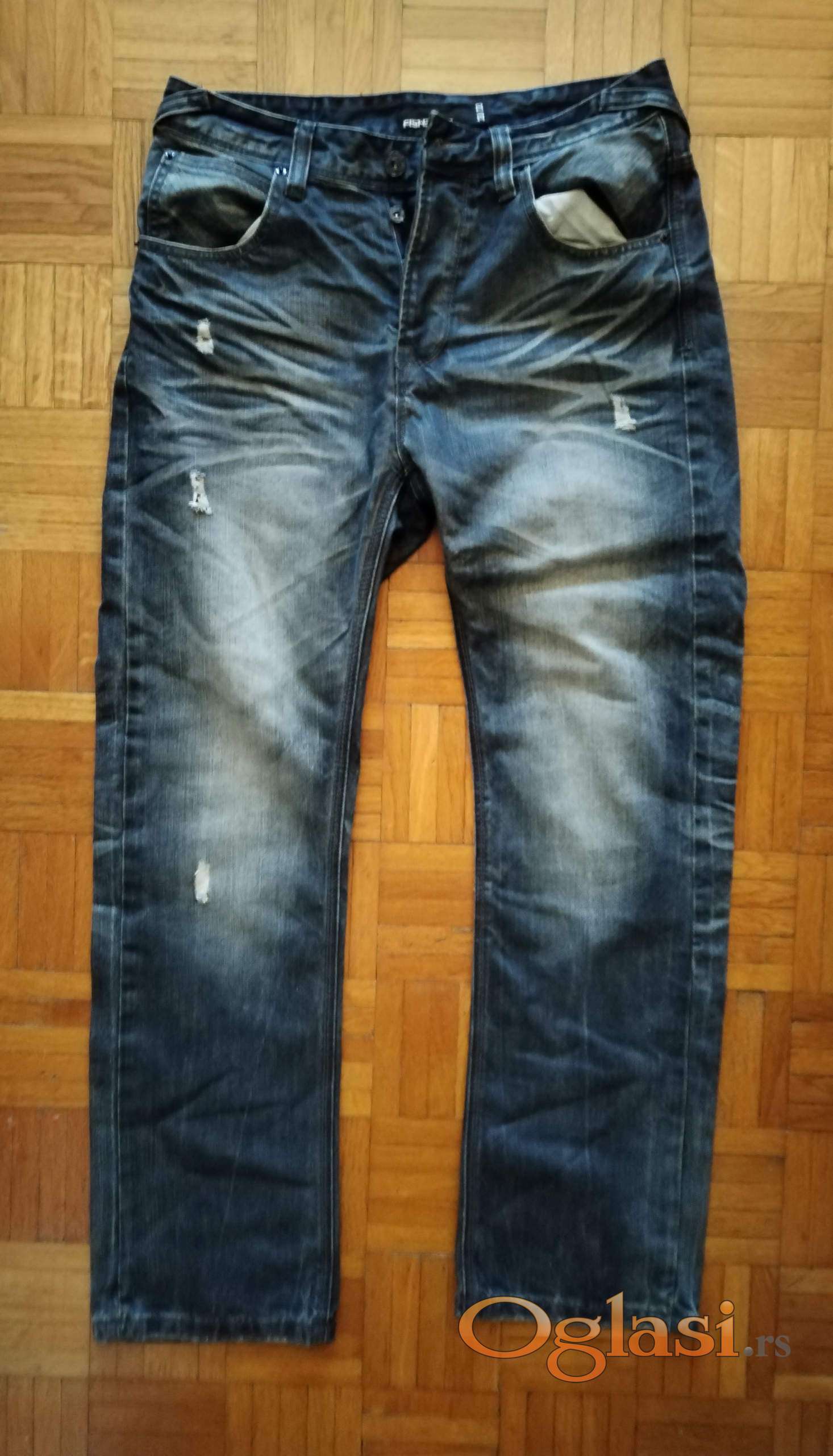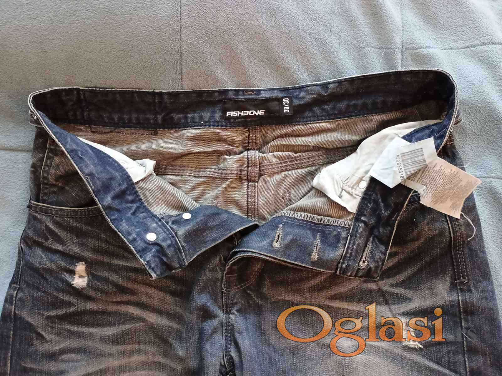 Farmerke tamno sive i plave boje, fancy i urban, sa iscepanim i izbledelim detaljima. Nošene ali vrlo dobro očuvane. Broj 30, dužina 30. Marka Fishbone.
