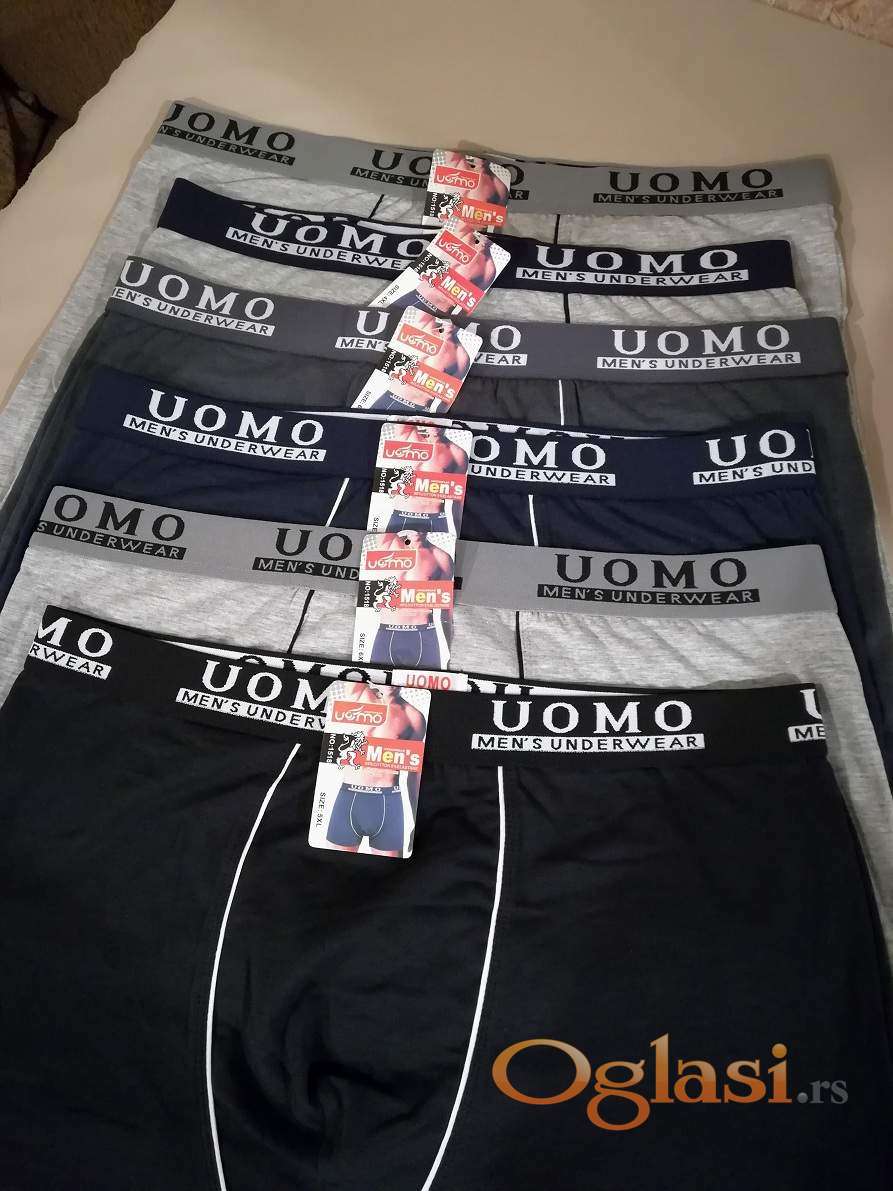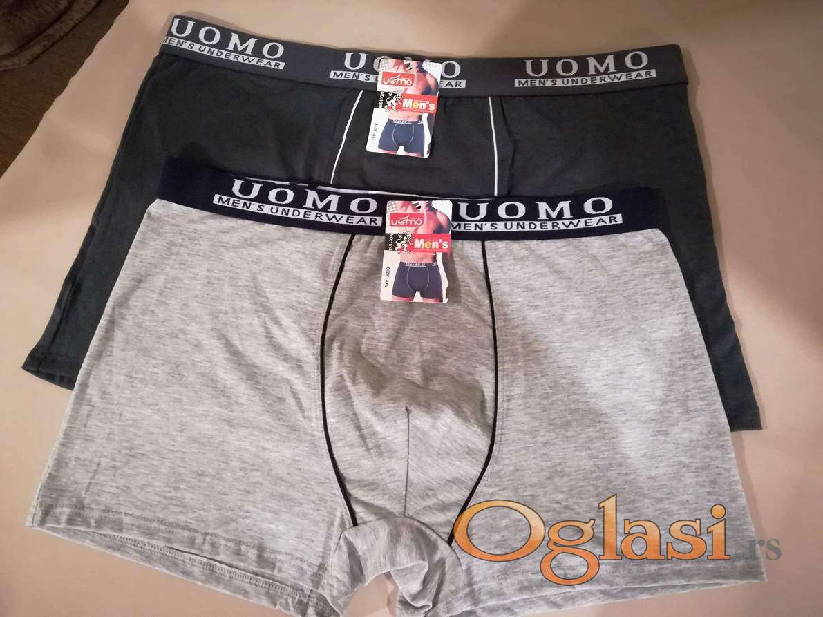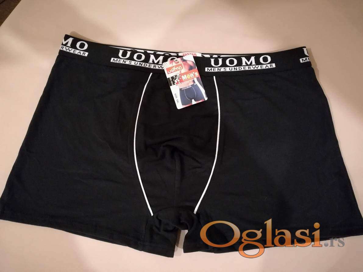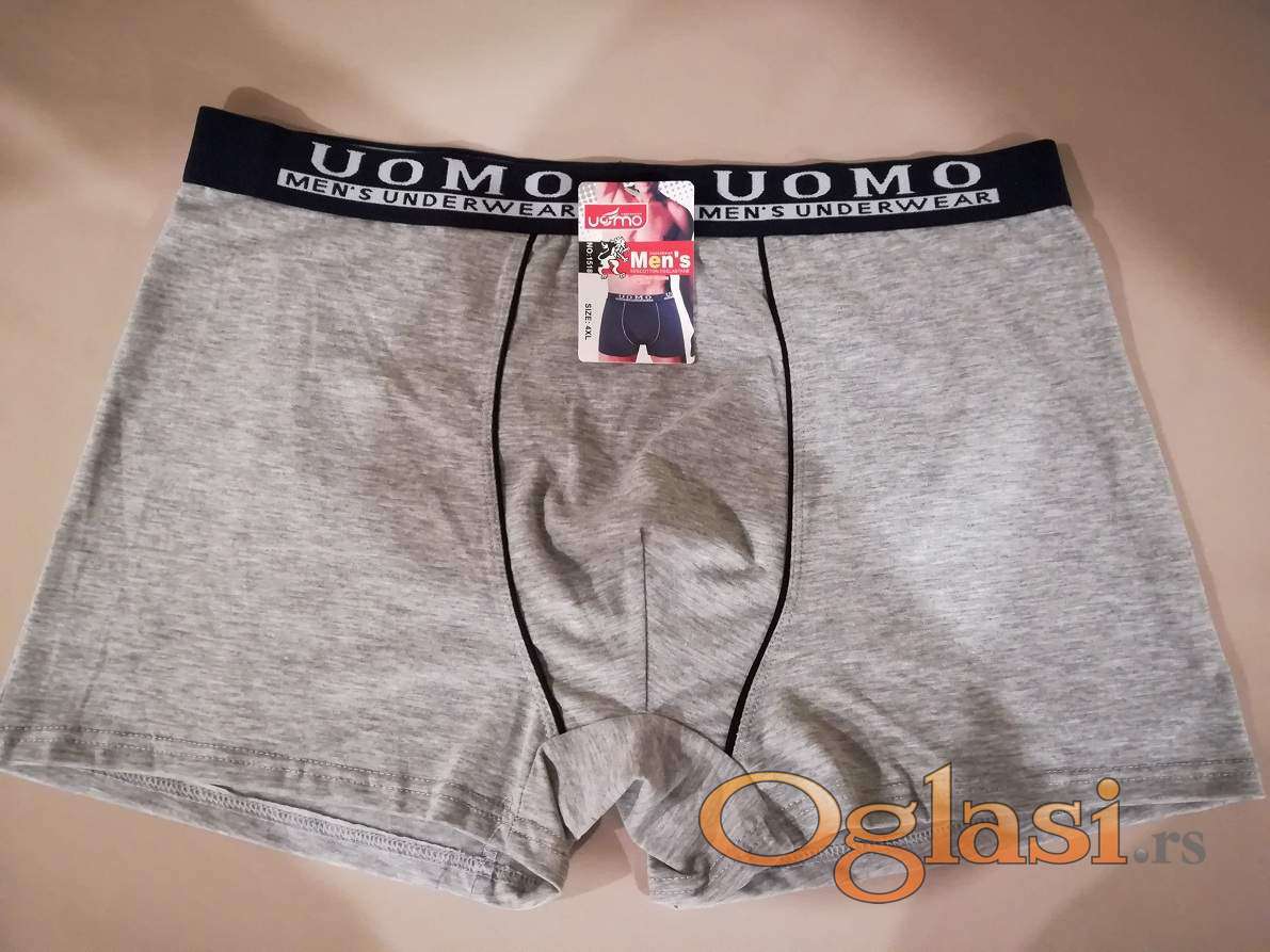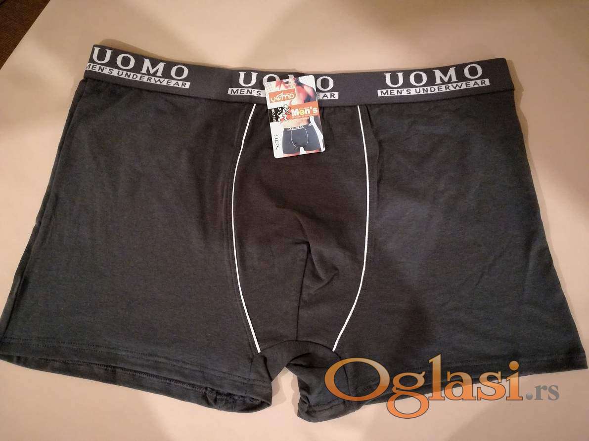 Muske pamucne bokserice u velikim brojevima Uomo su nove sa etiketom. Velicine 4XL i 5XL se prodaju po ceni od 400 dinara komad dok se velicina 6XL prodaje po ceni od 450 dinara komad.