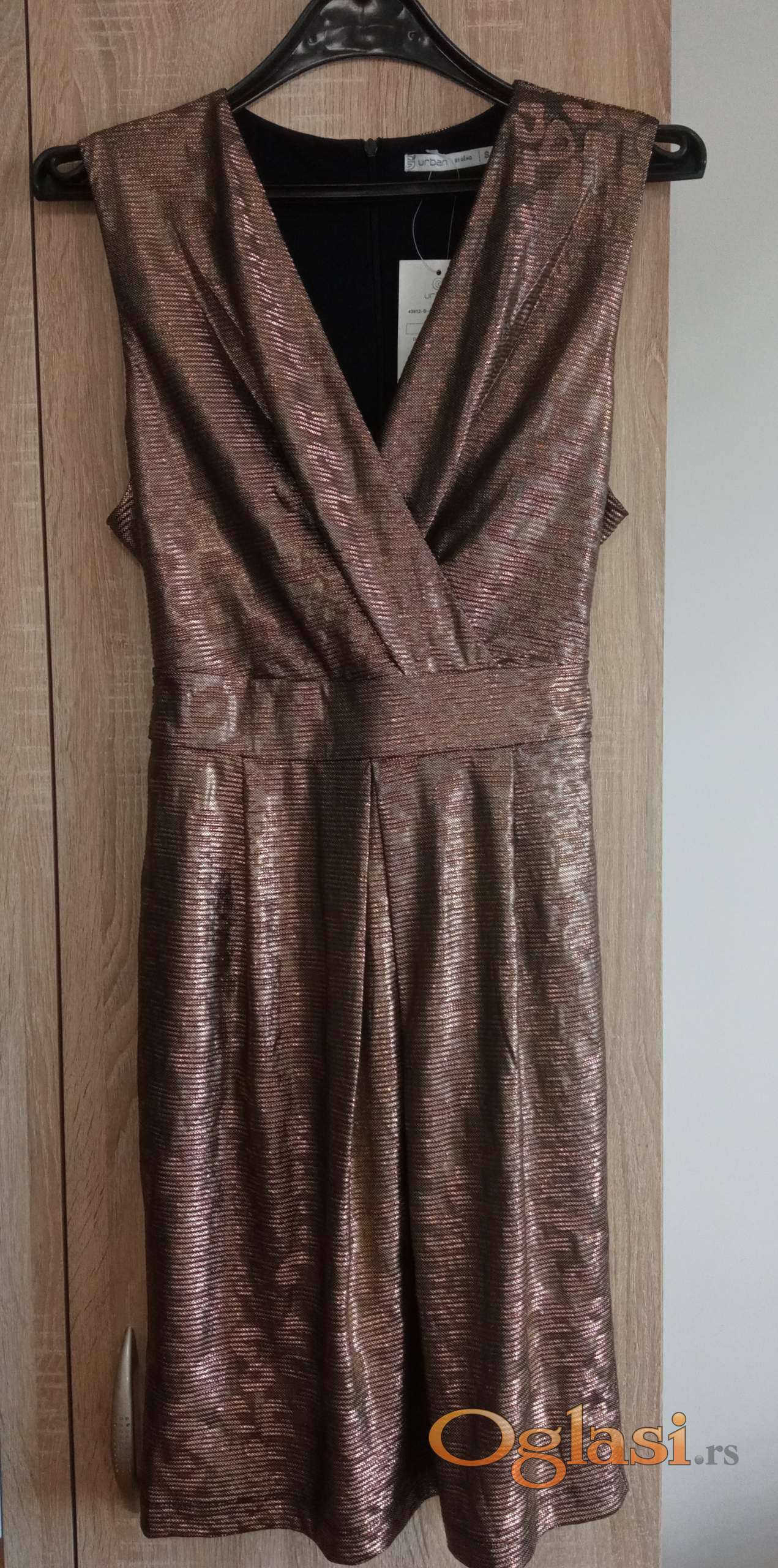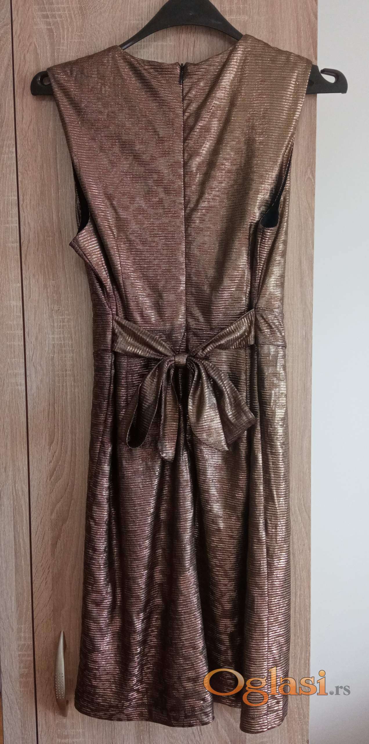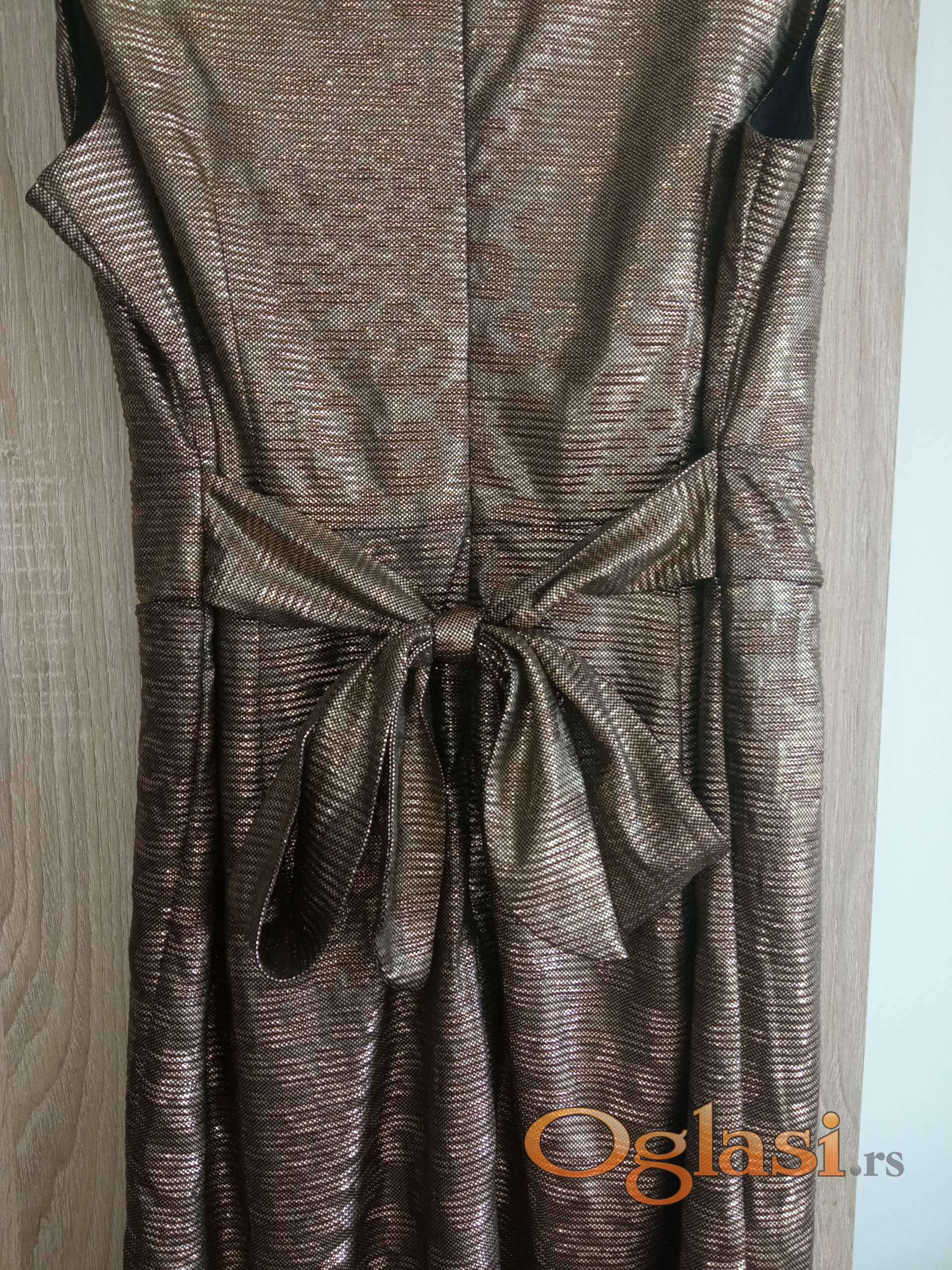 Maturska haljina u zlatnoj boji sa V izrezom napred i masnom i rajfeslusom na ledjima