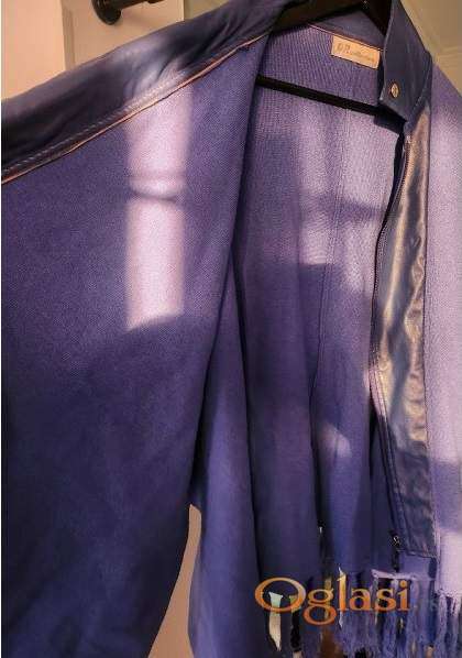 Pončo od trikotaže, sa umetkom kožnog napred dela gde je cibzar za kopčanje. Kragna kožna. Divno plave boje. Rese na rubovima. Rukavi 3/4.Nošen, ali očuvan.