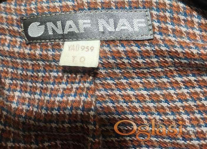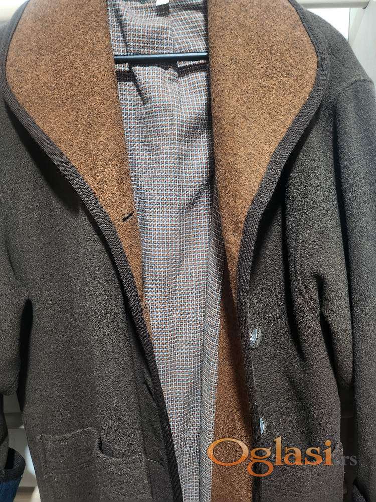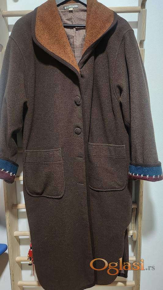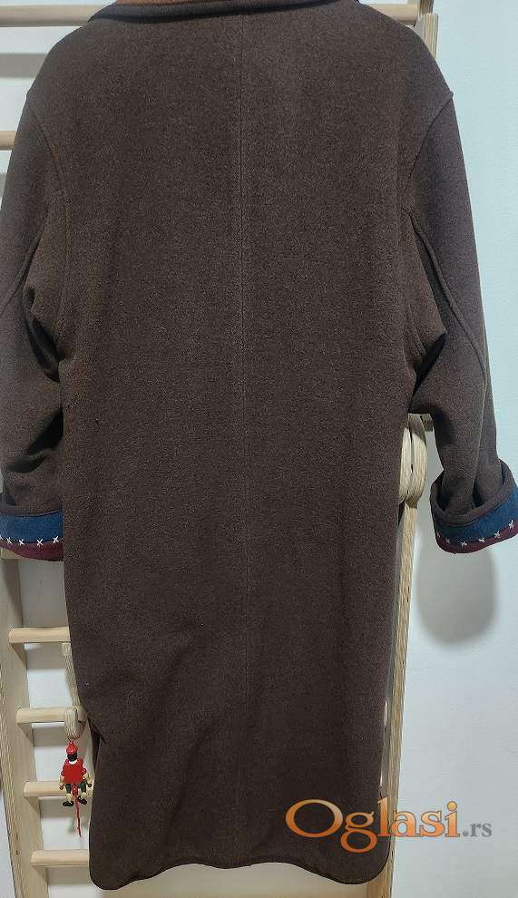 Kaput NAF NAF, uni veličine, od vune, lana , poliamida, topao i mekan, braon boje sa ornamentima na rubovima rukava u petrolej boji, postavljen pamučnim punjenjem i zato je savršeno topao, kopčanje na dugmad, donet iz Francuske, nošen par puta, očuvan . Dužina je maksi, a sam on je oversized casual varijanta.