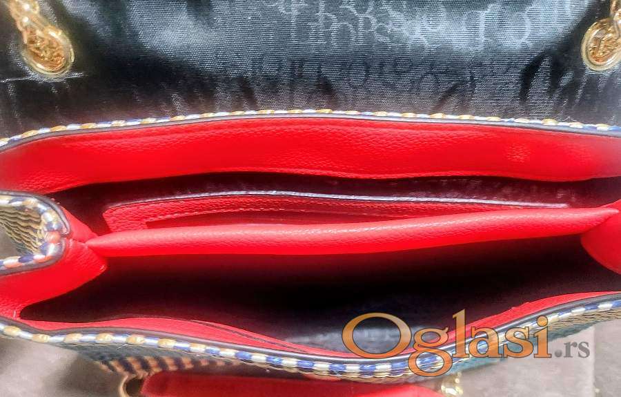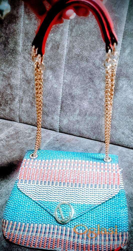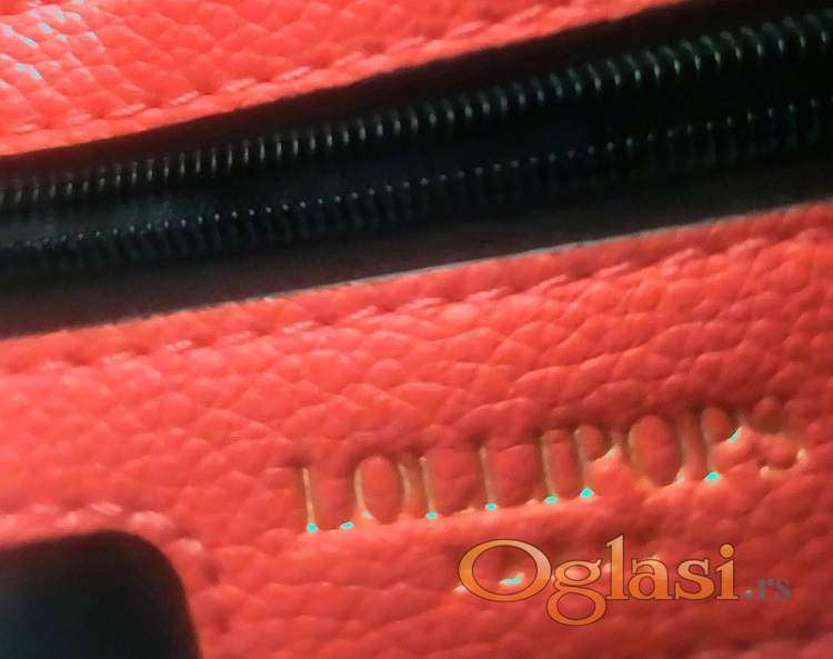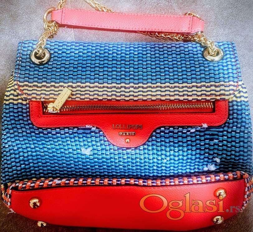 Lollipops torba, sa lancima za nošenje na ramenu ili u ruci. Lanci se podešavaju provlačenjem da budu na jedan lanac na rame ili duplo za nošenje u ruci. Materijal je kombinacija prave kože narandžaste boje i šarenim pletenim motivima, intenzivnih boja koje se ne mogu dočarati slikom. Original, kupljen u Francuskoj, nošen jedan put.Preklapa se a unutra je postavljeno sa monogram tkaninom na driker kopčanje sa ugraviranim njihovim amblemom tj.natpisom. Prostrana iako nije velika ima dve pregrade, jedan mali džep sa pečatom originalnosti na koži. Na poleđini torbe je još jedan džep ali zbog ograničenosti slika na sajtu, možete tražiti detaljnije slike i video snimak. Dno torbe sa spoljne strane je kožno. Dimenzije torbe su :25cm u najširem delu na sredini, 20cm visina. Napred je kopča sa inicijalom brenda