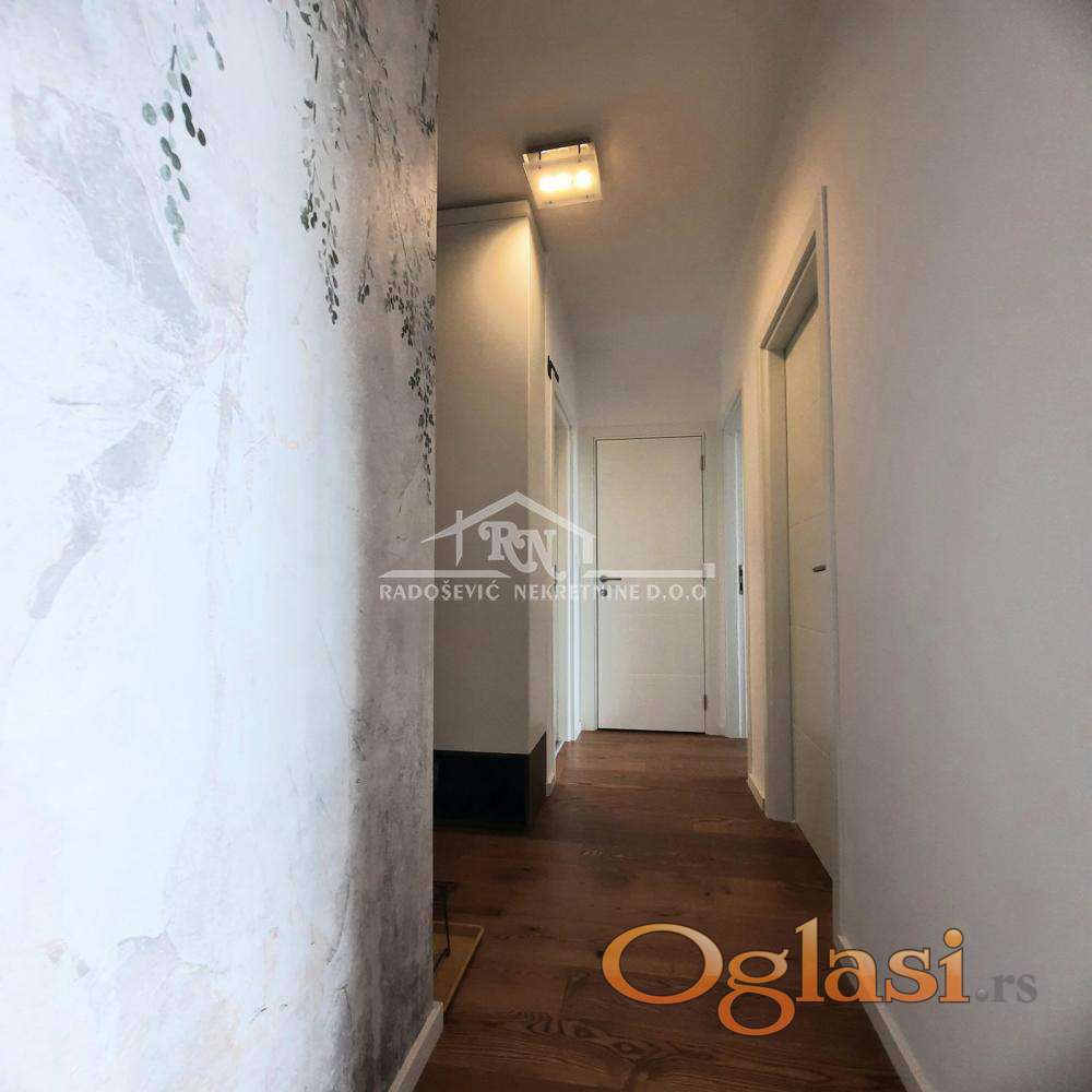 U jednom od najtraženijih naselja opštine Palilula, u Višnjičkoj Banji u naselju Sunnyville nudimo vam nov, luks, namešten, odmah useljiv trosoban stan na 1. spratu. Ovaj svetao i istočno orjentisan stan se sastoji od ulaznog predsoblja, hodnika, dnevnog boravka sa trpezarijom, kuhinje, kupatila, ostave, i dve spavaće sobe od kojih je jedna spavaća soba sa garderoberom. Stan je opremljen kuhinjom i belom tehnikom (mašinom za pranje posuđa i kompletnom opremom, posuđem i ostalim pokućstvom). Stan je opremljen i veš mašinom, televizorom, klima uređajem, roletnama sa daljinskim upravljačem. U stanu je centralno grejanje sa kalorimetrima. Na terasu se izlazi iz dnevne sobe sa pogledom na Dunav. U okruženju je dosta parking mesta. Izdaje se zakupcima koji ne konzumiraju cigarete, bez kućnih ljubimaca. U samoj zgradi je Maxi prodavnica. Naselje je dobro povezano gradskim prevozom do centra grada. Ukupni troškovi računa za ovaj stan su 120-140 eura. Mesečno plaćanje i obavezan depozit u visini jedne stanarine. Stan je za svaku preporuku.