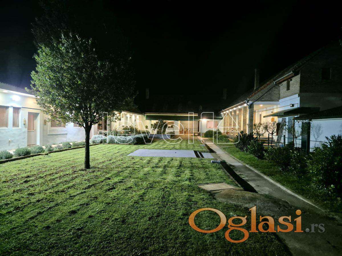 Dvorište je prava zelena oaza – automatsko zalivanje pokriva prostranu travnatu površinu, a bunar sa čak sedam česmi olakšava održavanje raskošnog bilja: ruže, lavanda, tuje, lovor, tisa, hrast, parkovna paulovnija. Cela parcela je ograđena i pod video-nadzorom, što pruža sigurnost i potpunu privatnost.