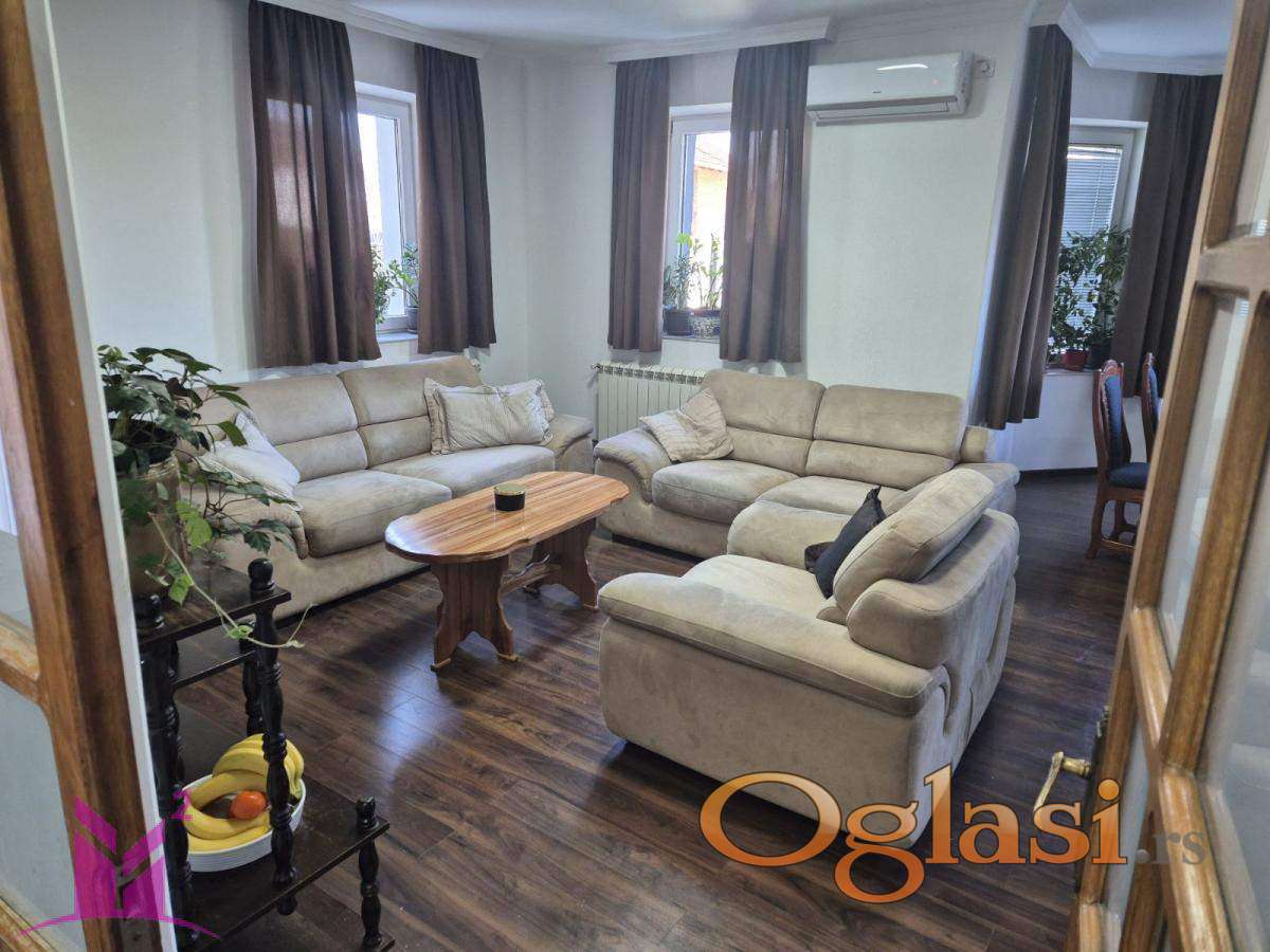 Odlična kuća na placu površine 5 ari. Kuća je spratna,zidana na ciglu I po sa izolacijom između cigli I stiroporom desetkom na svim zidovima sa spoljne strane kuće.Kuća ima 206m2 korisne površine i sastoji se od dva odvojena, kompletno nameštena stana. Na prizemlju je četvorosoban stan sa odličnim funkcionalnim rasporedom prostorija (prostran dnevni boravak sa kuhinjom, tri spavaće sobe, kupatilo i toalet). Sprat je sličan prizemlju samo ima jednu sobu manje,ali I jednu veliku spavaću sobu sa dvoje vrata I dva prozora pa se može podeliti na dve.. Postoje i terase, kao i podrum.U kući je razvedeno centralno grejanje na gas.Spratovi imaju odvojena brojila za struju.Pored postoji I druga kuća od 130m2 je u sirovom stanju, ima uvedenu struju i vodu, možete po želji napraviti soba koliko želite. U prizemlju te kuće je i garaža. Uređeno dvorište,pogodno za razne aktivnosti I igru dece. Nalazi se na lepoj lokaciji, blizu okretnice autobusa na Novom naselju.
