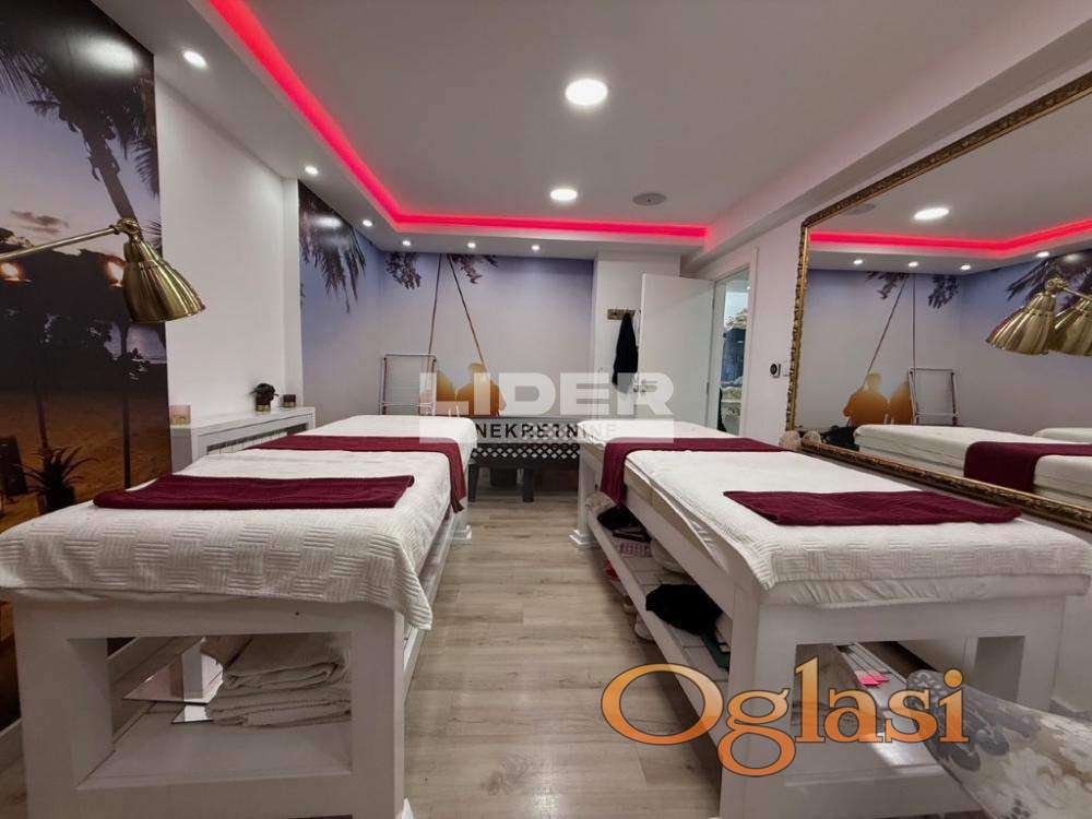 Na prvom nivou nalazi se impozantno velika prostorij, kuhinja, tehnička soba, toalet sa dva m.č., odvojen deo sa laserima, pedikirom, prostorije za masažu, u gornjem delu je velika prostorija iz koje se ide u ostale sobe i takodje odvojen toalet.
