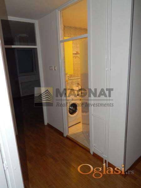 Prostor je polunamešten, sa potpuno opremljenom kuhinjom (šporet, frižider, mašina za pranje sudova) i mašinom za veš u kupatilu.