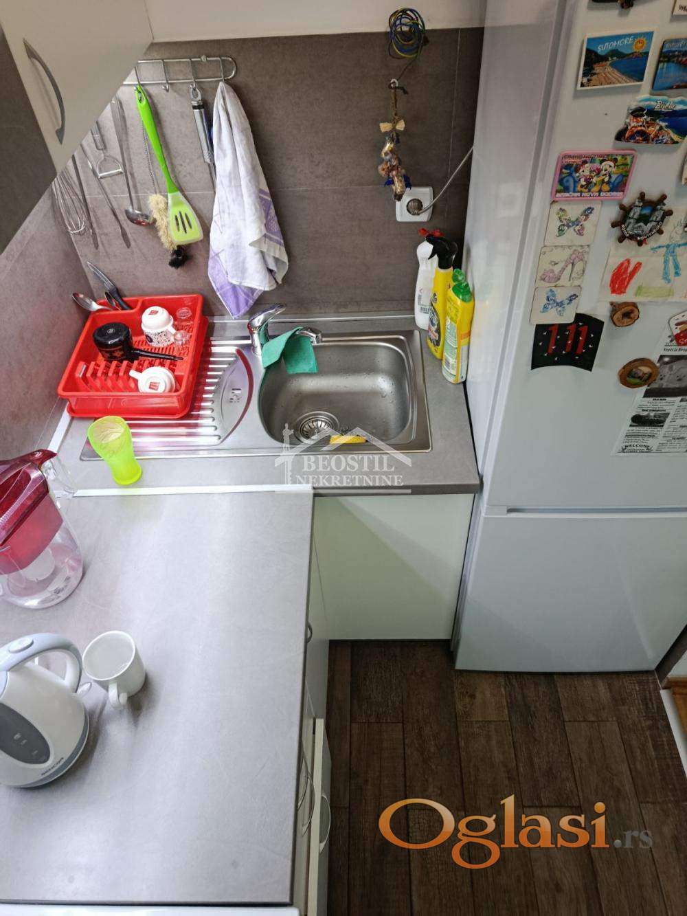 Odlično koncipiran jednoiposoban stan. Ulazni deo odvojen zidom od ostalog dela stana. Mala kuhinja i trpezarija, dnevni boravak, mali koridor do kupatila sa mestom za veš mašinu i dosta prostrane sobe sa pogledom n aterasu od 15m2. PVC stolarija sa roletnama, medijapan unutrašnja stolarija, hrastov parket.