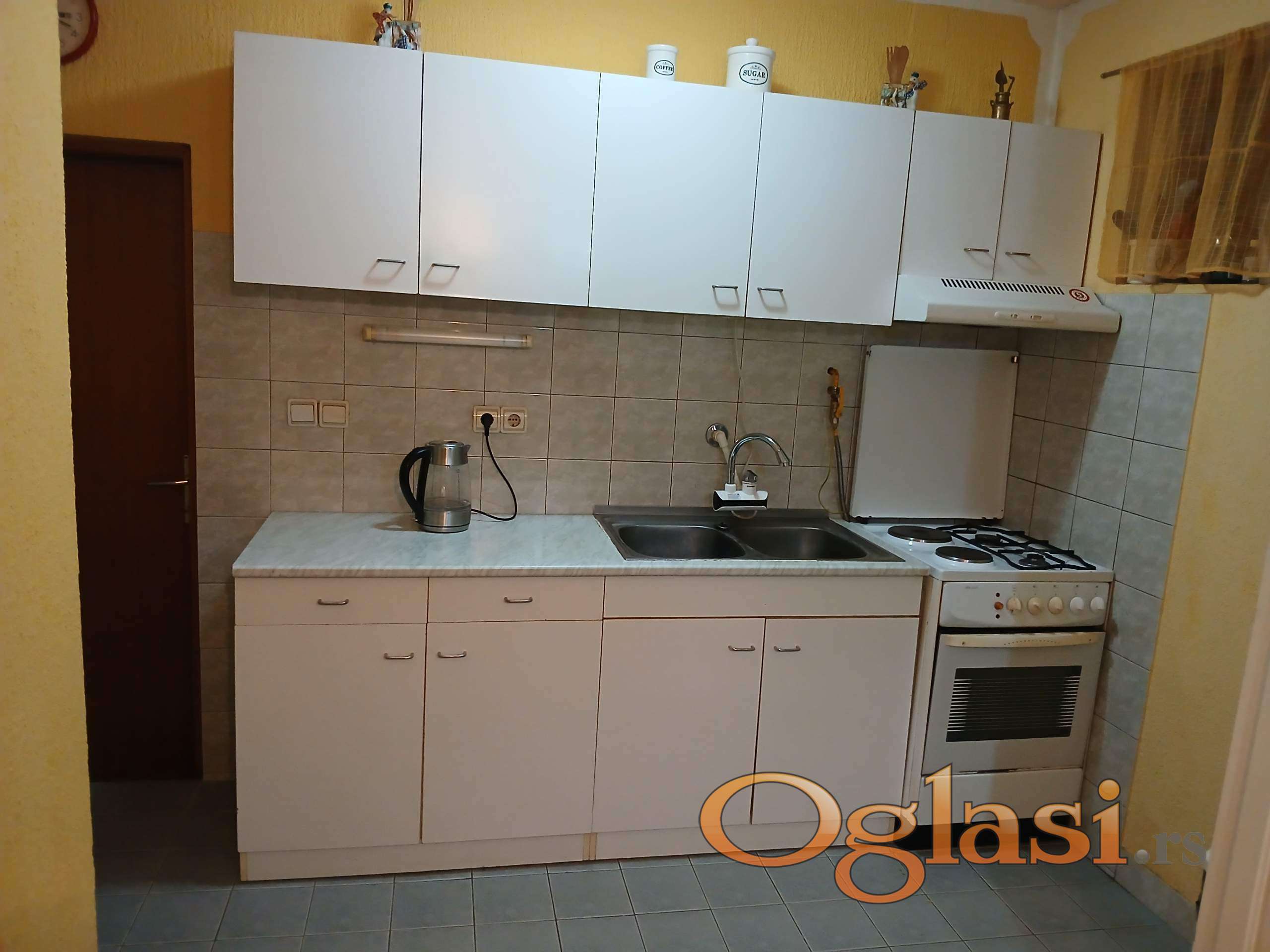 Lepo očuvan bela kuhinja sa sudoperom,šporetom i aspiratorom. Dužina:donji deo 180 cm + 60 cm ( šporet),gornji 240 cm.