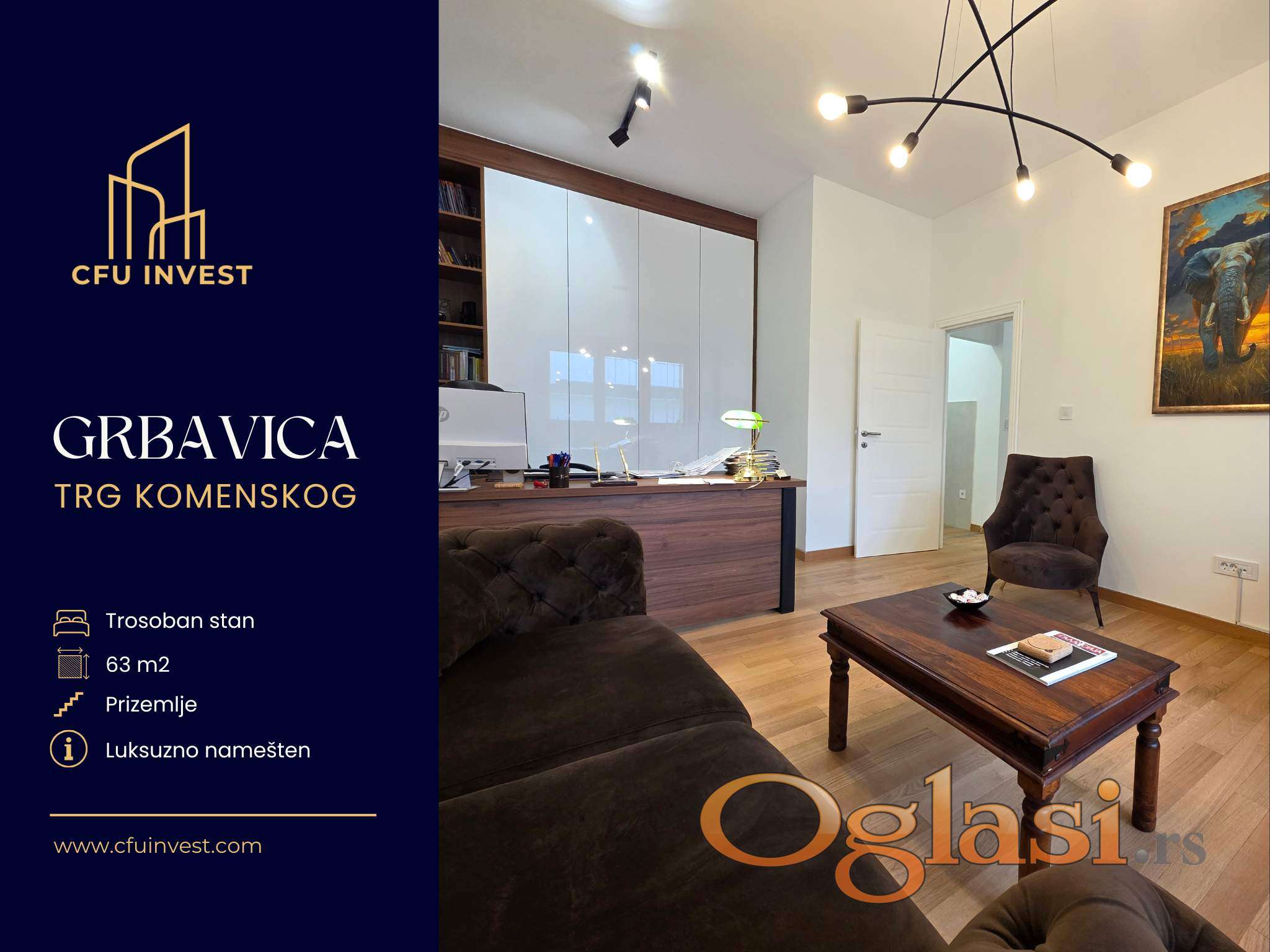 Prodaje se luksuzno opremljen i kompletno namešten trosoban stan površine 63 m² na visokom prizemlju u izuzetno atraktivnoj zgradi na Trgu Komenskog.