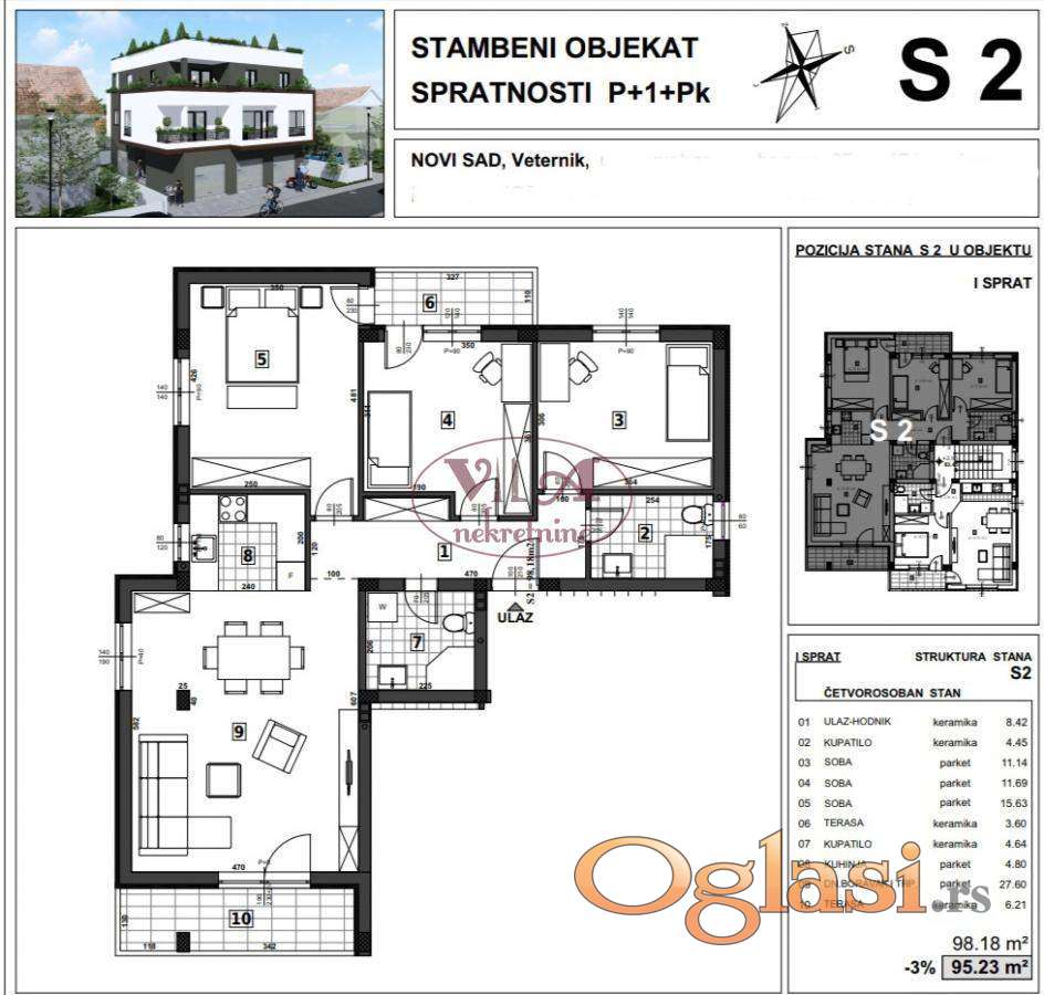 Prodaje se lep cetvorosoban stan u manjoj zgradi, urbanoj vili,na samoj granici Novog Sada i Veternika u lepoj i širokoj ulici, blizu svih urbanih sadržaja. Stan se nalazi na prvom spratu urbane vile, kvalitetno gradjene po svim standardima modernog i komfornog stanovanja. Grejanje je podno na gas sa kalorimetrima. Stan ima veliku dnevnu sobu, koja je okrenuta na uličnu stranu, dok su tri spavaće sobe dvoriŝno orijentisane. Stan ima dva kupatila, predsoblje i kuhinju koja je povezana sa dnevnom sobom i dve terase.Pored stana se moze kupiti i garaža u prizemlju objekta. Investitor je siguran i pouzdan sa svom urednom dokumentacijom i dozvolama i za kupce prvog stana, može se ostvariti povrat Pdv-a od 10%.Rok završetka izgradnje je predvidjen za oktobar 2026. godine. Pored ovog stana se može kupiti i još dva trosobna stana.Vredi pogledati, odlična nekretnina.Tel 065/424 55 77 i 064/6586099. Više fotografija na našem sajtu.