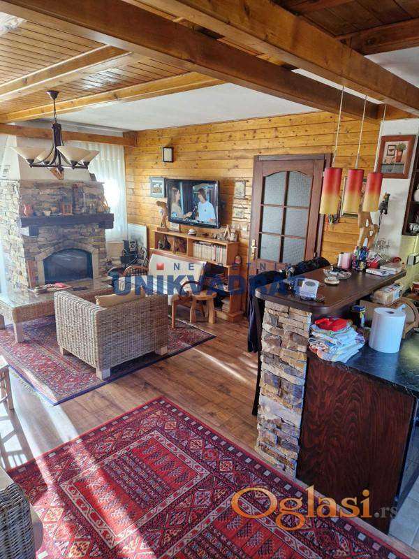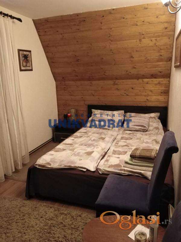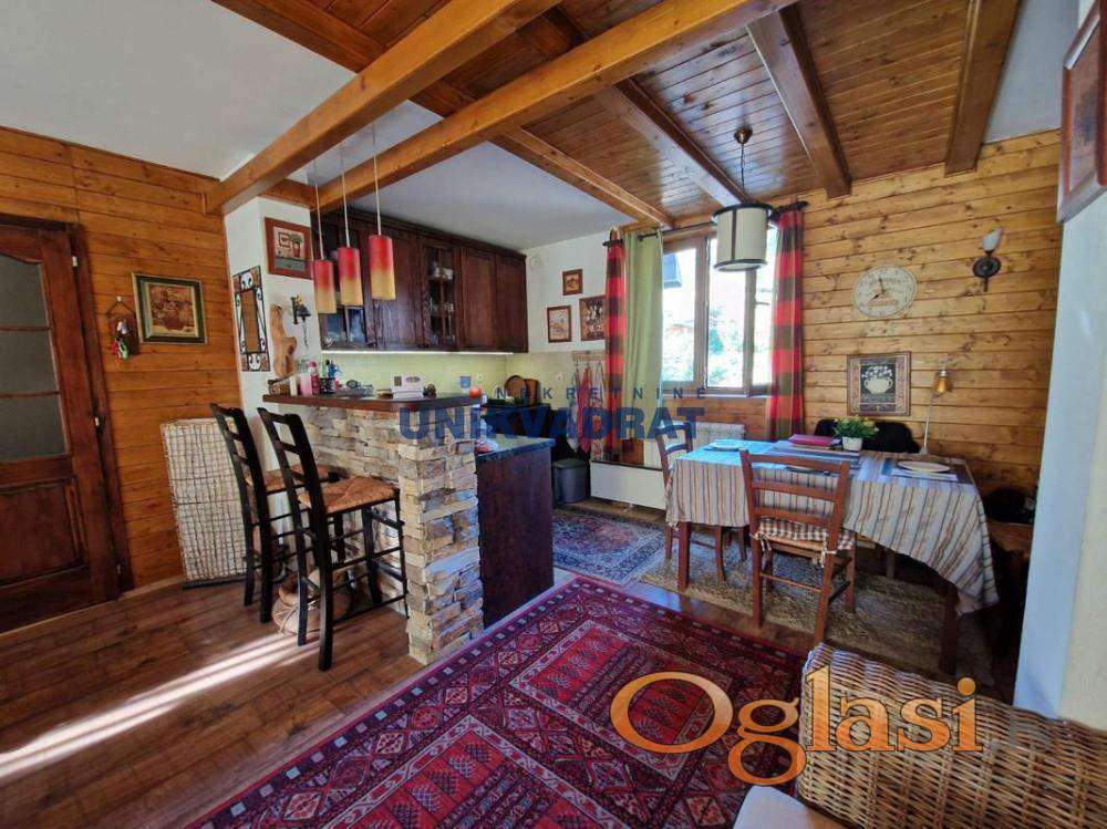 Na spratu od 61m2 je kupatilo, dnevni boravak sa kuhinjom i trpezarijom,kamin i sa zavesom odvojen deo sa bračnim krevetom i velika terasa.