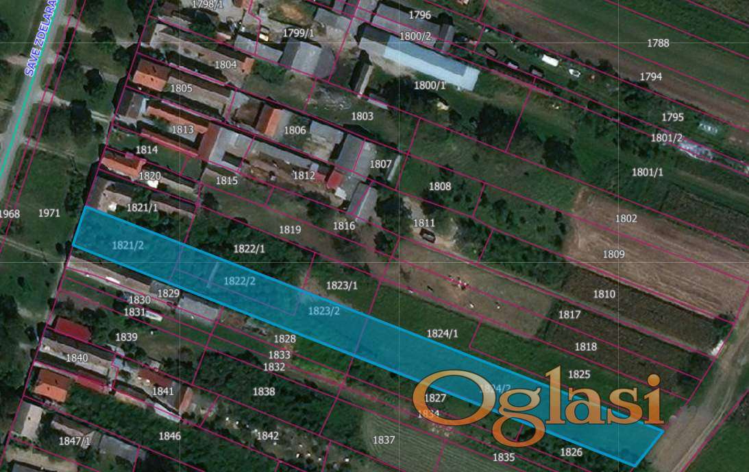 Na prodaju građevinski plac od 37a. Ima izlaz na dve ulice. Front 16,5m, dubina 240m. Ukupno četiri parcele: 1821/2 (630m2), 1822/2 (509m2), 1823/2 (679m2), 1824/2 (1954m2). Nalazi se u glavnoj ulici Save Zdelara.