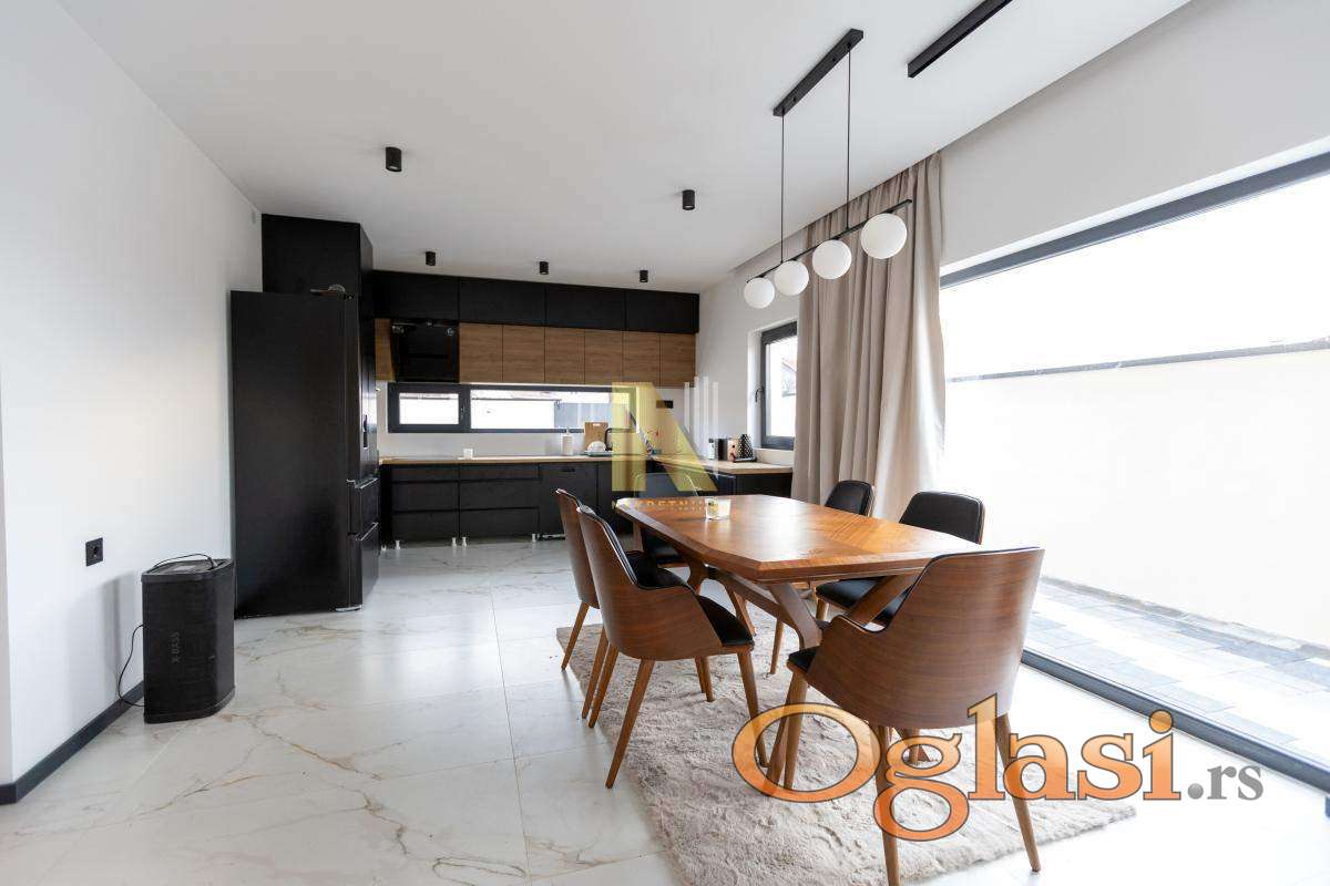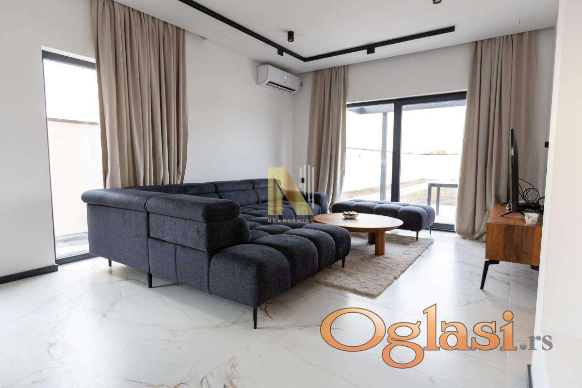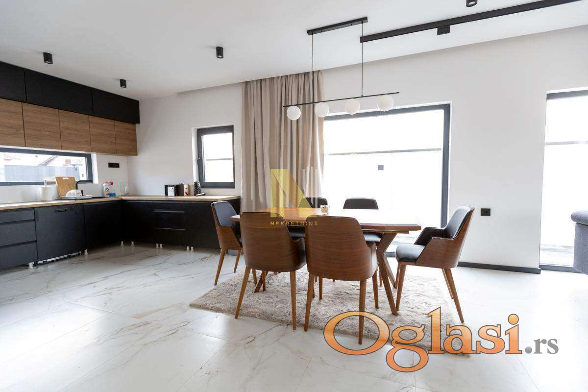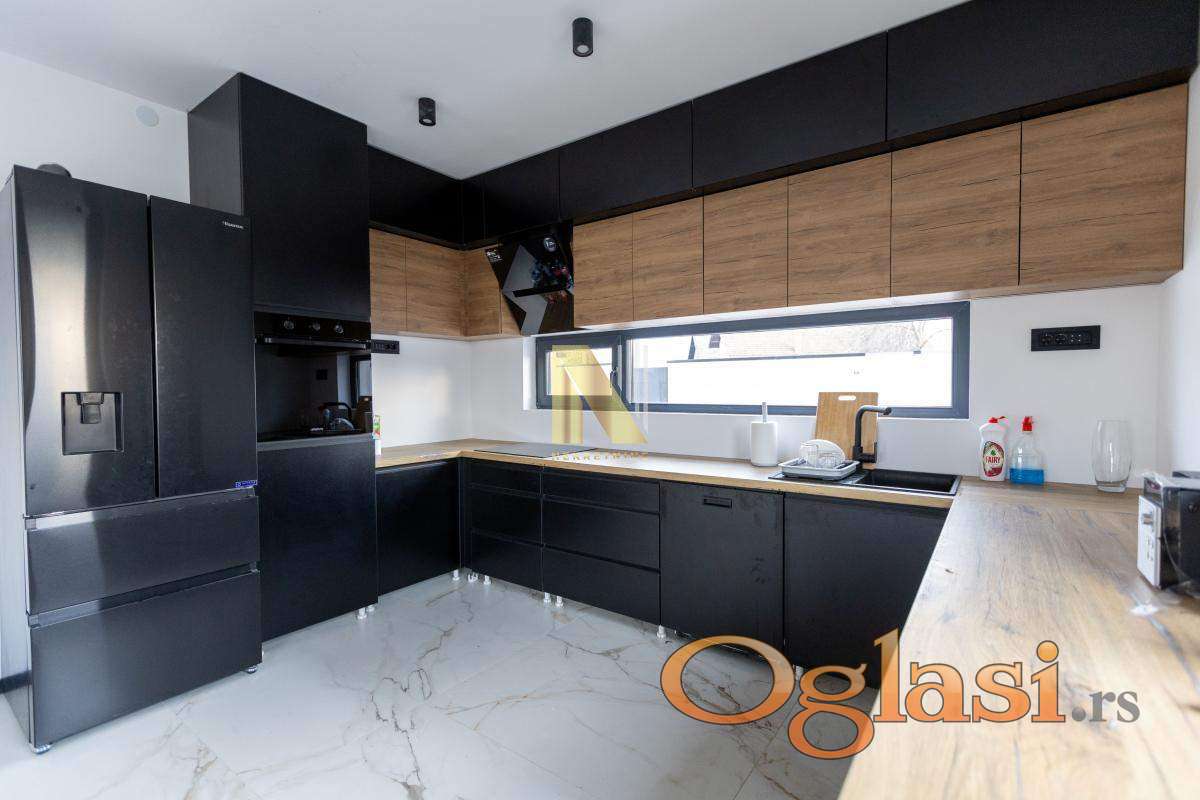 Na prodaju nova montažna kuća u Veterniku - potpuno sređena, useljiva odmah. Ako tražite nov, moderan i fukcionalan dom bez ikakvih ulaganja, ovo je prava prilika. Kuća je kompletno završena i pažljivo uređena, u lepom i mirnom delu Veternika. Projektovana je tako da pruža maksimalnu udobnost i praktičnost za porodičan život. Sastoji se u donjem delu iz prostrane dnevne sobe sa kuhinjom i trpezarijom. Prostor je veoma svetao i ima izlazak na veliku terasu na koju se nastavlja dvorište sa instaliranim zalivnim sistemom. U prizemlju se još nalaze spavaća soba, kupatilo i hodnik. Modernim stepenicama povezano je sa spratom kuće gde se nalaze tri spavaće sobe kupatilo i terase. Svaka soba ima izlaz na terasu. U kući je podno grejanje na toplotne pumpe, kao i inverter klime. Poseduje video nadzor.
