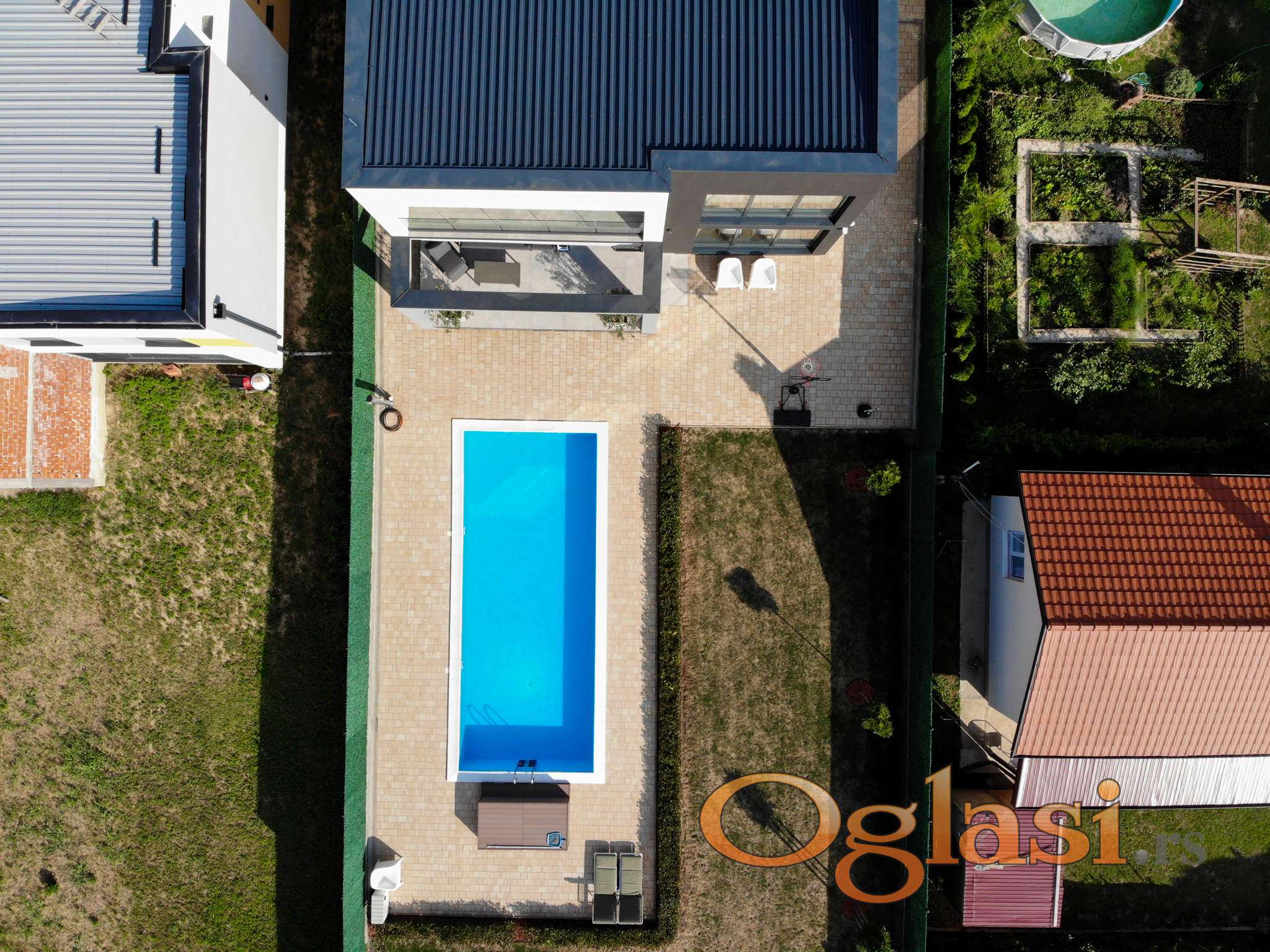 - Svaka soba ima izlaz na terasu. Iz dnevne sobe izlazi se na terasu na koju se nastavlja dvorište sa bazenom i uređenim prostorom za uživanje. Dvorište je ograđeno zelenom ogradom i pruža potpunu privatnost i mir.