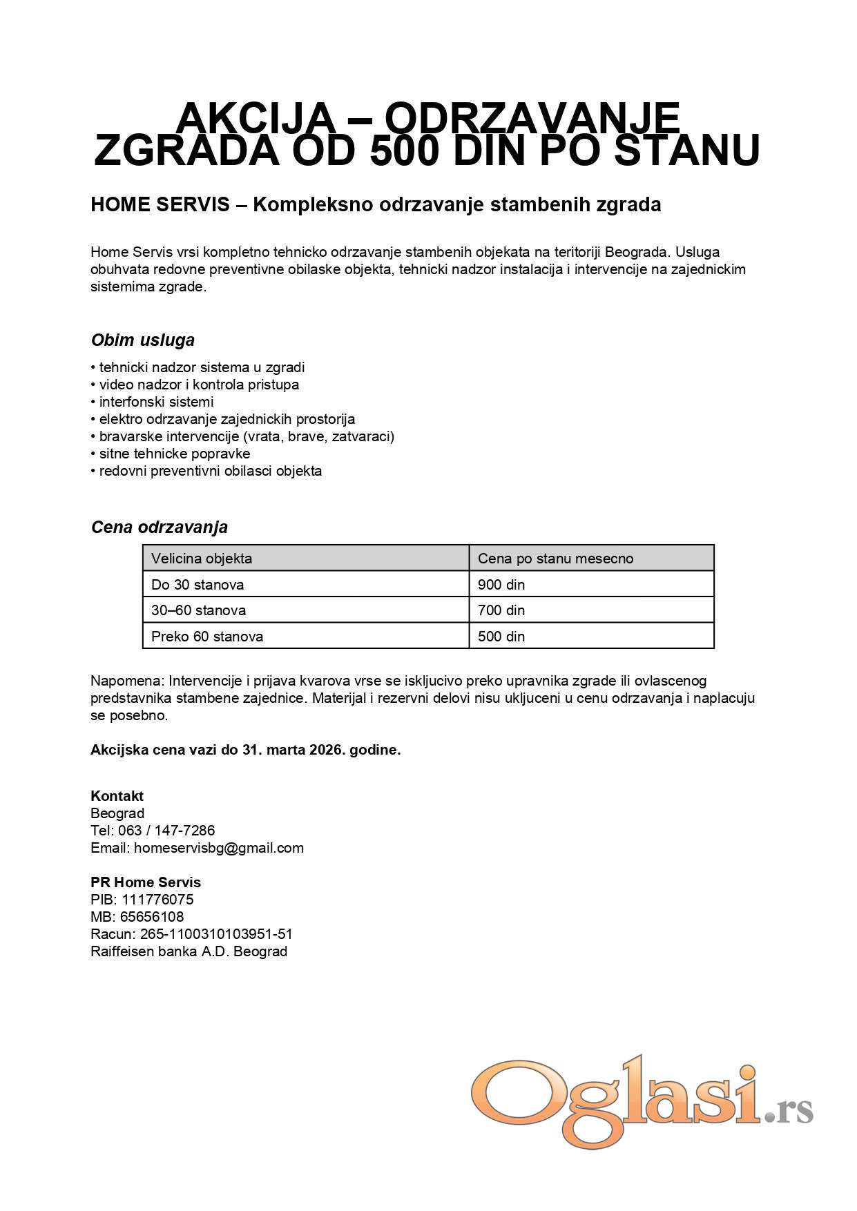 Napomena: Intervencije i prijava kvarova vrse se iskljucivo preko upravnika zgrade ili ovlascenog predstavnika stambene zajednice. Materijal i rezervni delovi nisu ukljuceni u cenu odrzavanja i naplacuju se posebno.