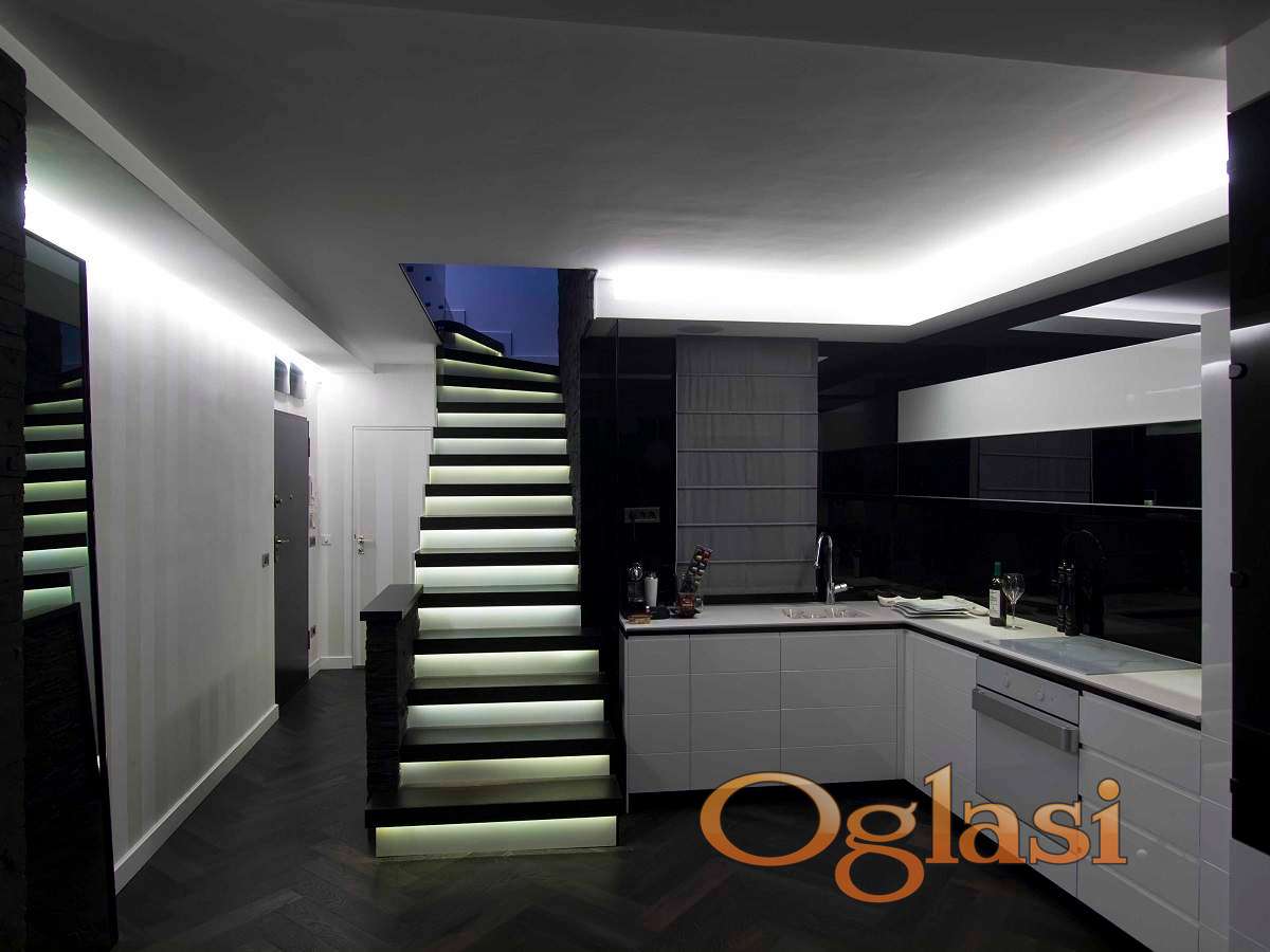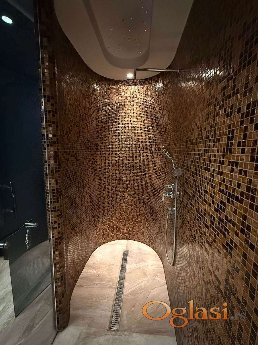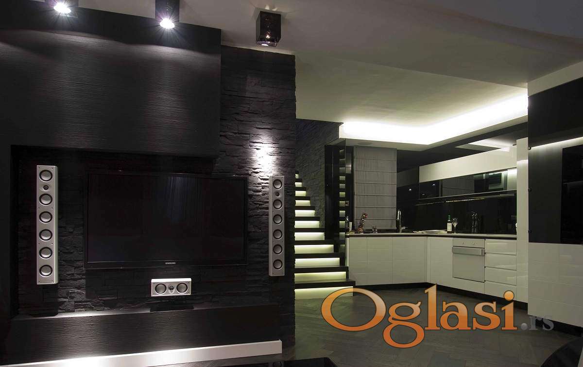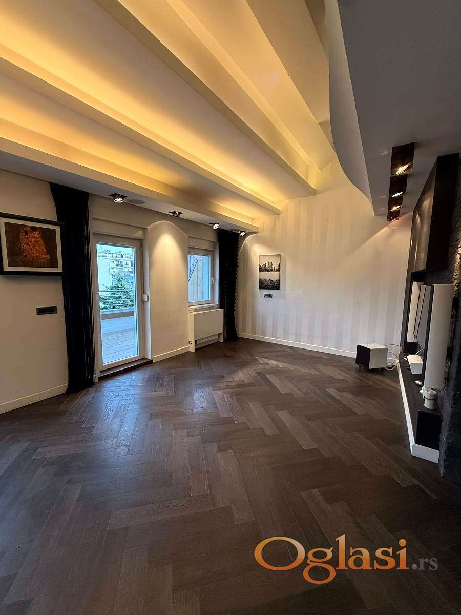 Posebna pažnja posvećena je kvalitetu završnih radova i detaljima. Stan je kompletno renoviran uz upotrebu prvoklasnih materijala – podove krasi hrastov parket, zidovi su oplemenjeni dekorativnim kamenom i pažljivo odabranim fototapetama, dok su kupatila opremljena vrhunskom uvoznom keramikom i modernim sanitarijama. Sve kosine su maksimalno iskorišćene ugradnim plakarima i dodatnim prostorom za odlaganje. Ambijentalna rasveta, pažljivo projektovana kroz ceo stan, dodatno naglašava sofisticiran karakter enterijera. Nekretnina je klimatizovana savremenim sistemima i opremljena kvalitetnim grejnim telima, što obezbeđuje optimalnu temperaturu i komfor tokom cele godine. Postoji mogućnost kupovine dva garažna mesta, cena jednog garažnog mesta je 30.000e.