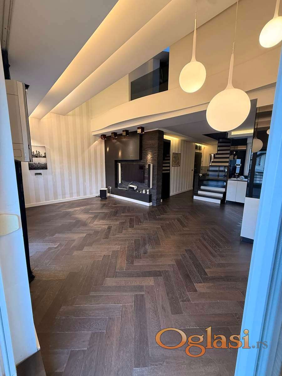 Stan je organizovan na dve etaže koje jasno razdvajaju dnevnu i noćnu zonu. Donji nivo odiše svetlošću i prostranošću, dnevni boravak je topao i prijatan, povezan sa moderno dizajniranom kuhinjom izrađenom po meri i opremljenom premium Bosch belom tehnikom. Na ovoj etaži se nalaze i funkcionalno predsoblje, elegantno kupatilo, kao i prostrana terasa sa otvorenim pogledom, idealna za uživanje i opuštanje u svako doba dana. Gornja etaža namenjena je miru i privatnosti. Čine je tri spavaće sobe i dodatno luksuzno kupatilo. Master spavaća soba je komforna i svetla, dok su preostale dve sobe izuzetno funkcionalne i prilagodljive različitim potrebama, pri čemu se jedna trenutno koristi kao garderober.