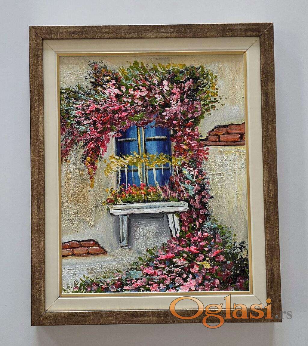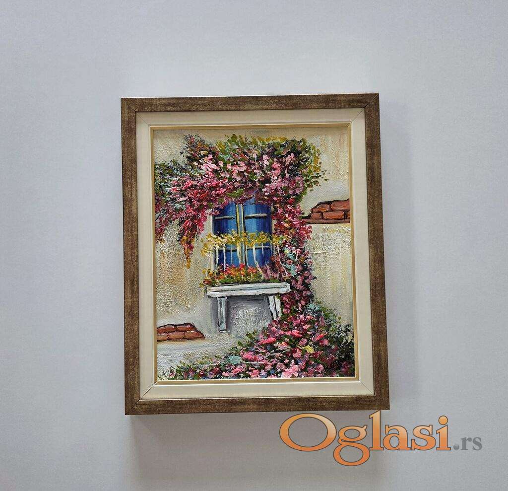 Ulje na platnu Terasa u cvecu, prelepo umetnicko delo. Slika je uramljena u jako lep ram, dimenzije slike sa ramom 45 x 37. Privatna kolekcija.