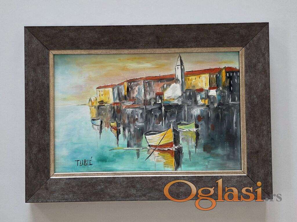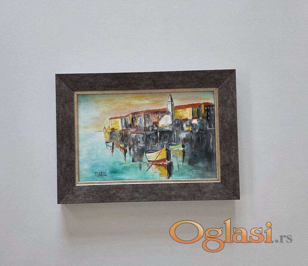 Ulje na lesonitu Grad uz more, prelepo umetnicko delo. Slika je uramljena u jako lep ram, dimenzije slike sa ramom 37 x 27. Privatna kolekcija.