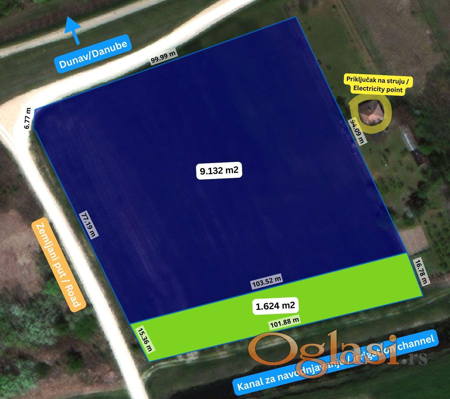 - Zelena površina (slika 2) 1.624 m2 - ovaj deo formalno gledano nije vlasništvo vlasnika ali se trenutno koristi tj obrađuje, pripada zaštitnom pojasu oko kanala za navodljavanje i u ovom delu nije dozvoljena gradnja