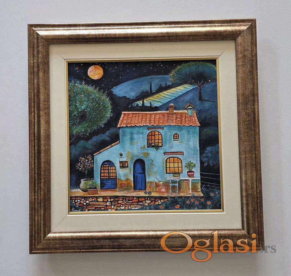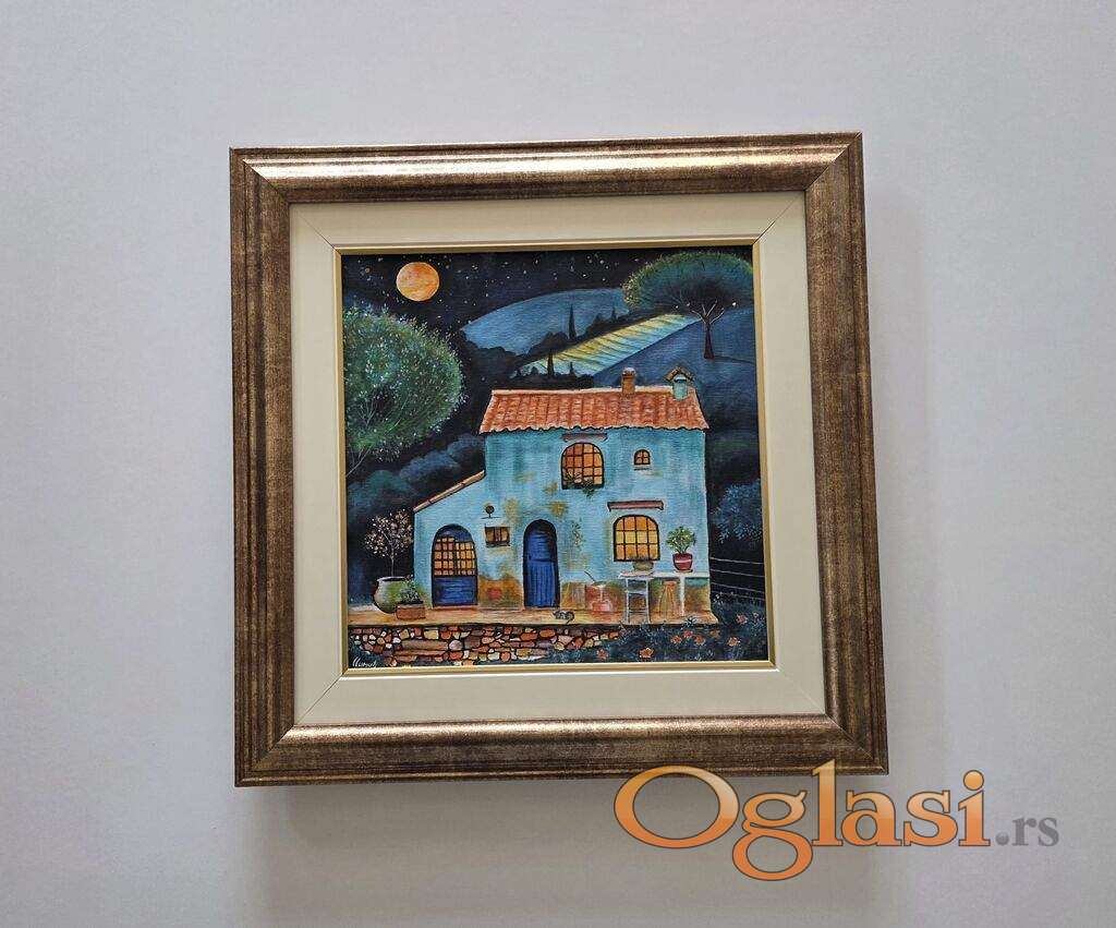 Slika Kuca pod mesecinom, tehnika akril na platnu. Prelepo umetnicko delo. Slika je uramljena u jako lep ram, dimenzije slike sa ramom 45 x 45. Privatna kolekcija.