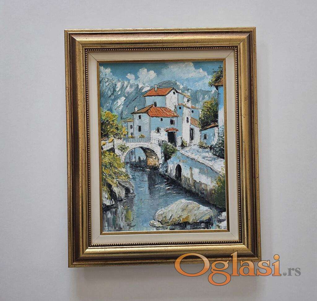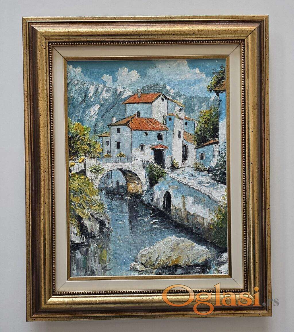 Ulje na platnu Most koji vodi kuci, prelepo umetnicko delo. Slika je uramljena u jako lep ram, dimenzije slike sa ramom 55 x 45. Privatna kolekcija.