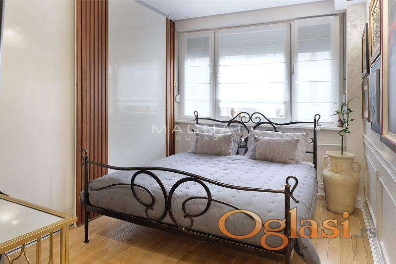 Komletno sredjen stan na trećem spratu zgrade sa liftom. Stan je svetao, dvostran, sa pogledom na park. Renoviran je materijalima vrhunskog kvaliteta. Promenjene vodovodne i elektro instalacije. Postavljena nova spoljna stolarija, sva vrata su Bosal, kvalitetna keramika i parket. Uradjena kompletna rasveta u stanu. Od prostorija ima veliki dnevni boravak sa trpezarijom, zasebnu kuhinju, spavaću sobu, kupatilo, gardarober, terasu i predsoblje. U stanu je centralno grejanje. Izvorno je stan bio dvoiposoban, adaptiran je u dvosoban. Trenutno stan funkcioniše kao dvosoban, lako se može vratiti na dvoiposoban. U stanu ostaje ugradna kuhinja i plakari. Uknjižen stan, moguća kupovina i na kredit. U blizini su škola, vrtić, prodavnice, stanica gradskog prevoza, Hram Svetog Save... 777 Oznaka na mapi pokazuje deo grada, ne i tačan položaj zgrade. Posrednička naknada 2%