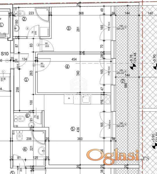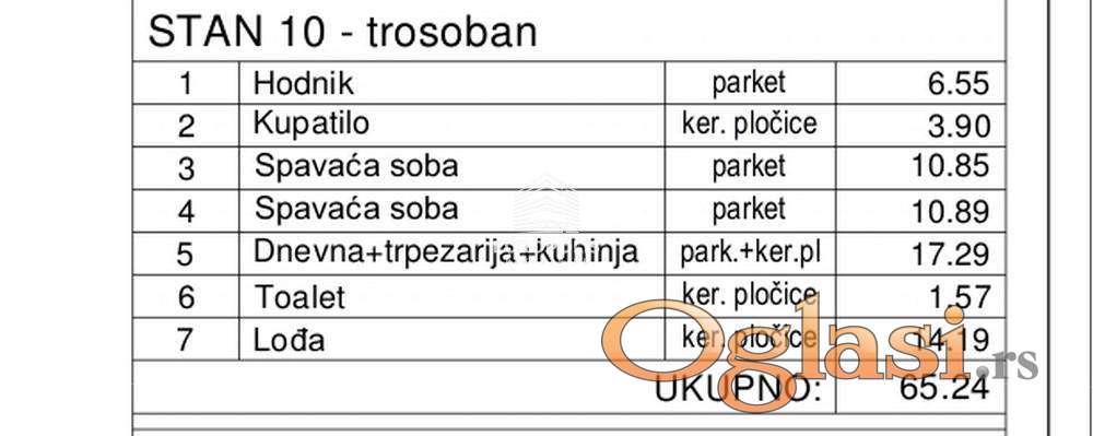 Raspored prostorija: hodnik, kupatilo, dve spavaće sobe, dnevna soba sa trpezarijom i kuhinjom, toalet, lođa.