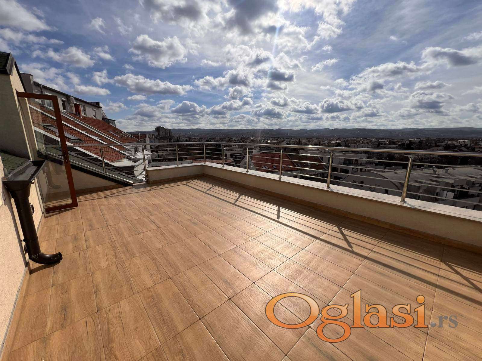 Prodaje se četvorosoban dupleks stan na TOP lokaciji, kod hotela Sheraton, površine 117m2. Stan se sastoji iz dnevne sobe sa kuhinjom i trpezarijom, tri spavaće sobe, dva kupatila, hodnika i dve terase (jedna ustakljena i jedna krovna terasa). Krovna terasa površine 24m2 pruža panoramski pogled na Frušku Goru. Na terasi podno grejanje, struja i priključak za vodu. Prodaje se sa dve inverter klime. Stan ne zahteva dodatna ulaganja. U blizini Osnovna škla Nikola Tesla, Klinički centar, Higijenski zavod, marketi, banka, prodavnice, restorani. Odlična povezanost linijama gradskog prevoza. Vredno svakog razgledanja.