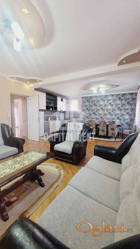 Izdaje se namešten stan koji se sastoji od hodnika,velike dnevne sobe sa trpezarijom i kuhinjom koja je opremljena sa svim uredjajima uključujuci i mašinu za sudove,spavaća soba ,kupatilo terasa i velika garaža.Stan se greje na pelet.