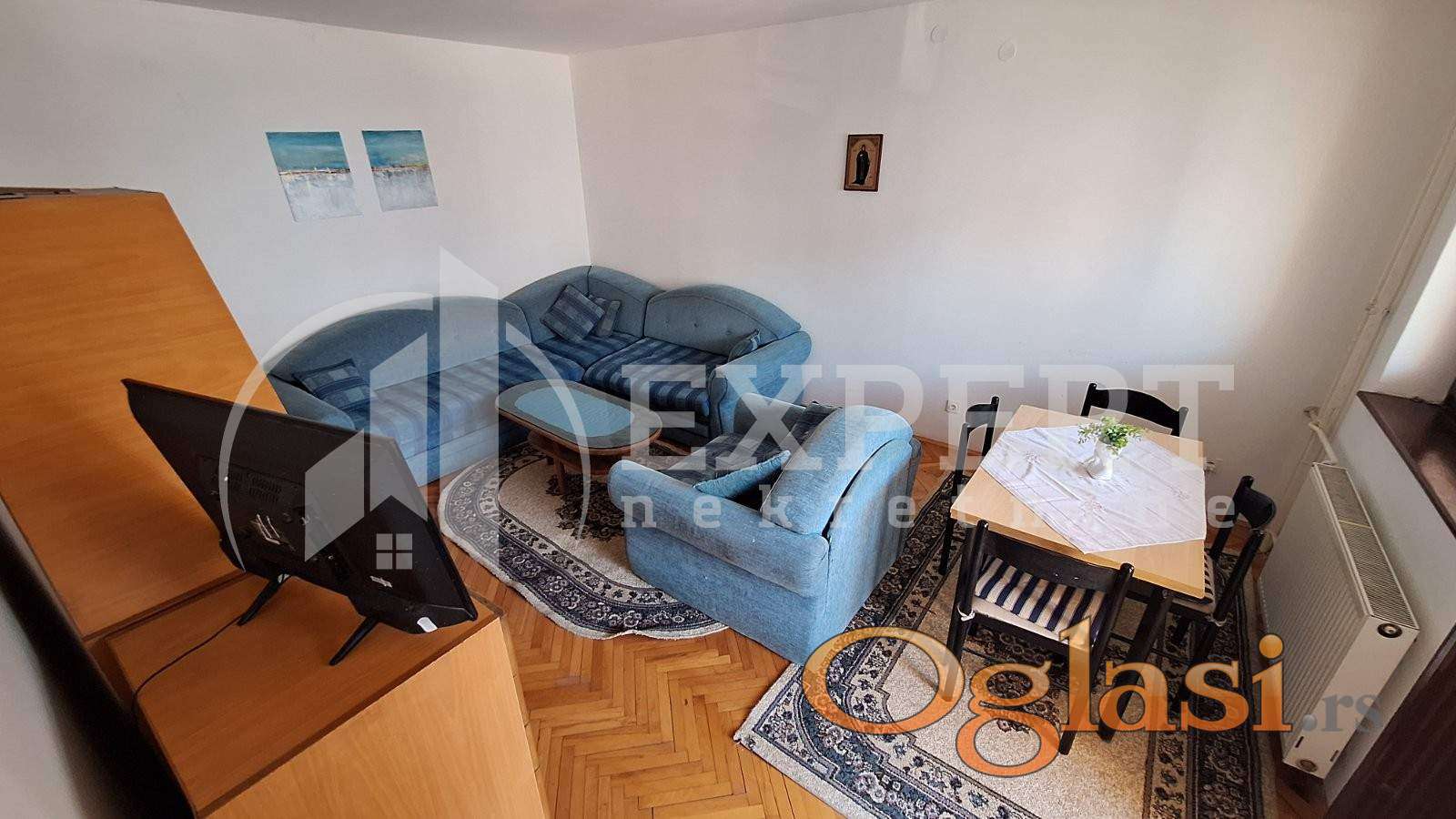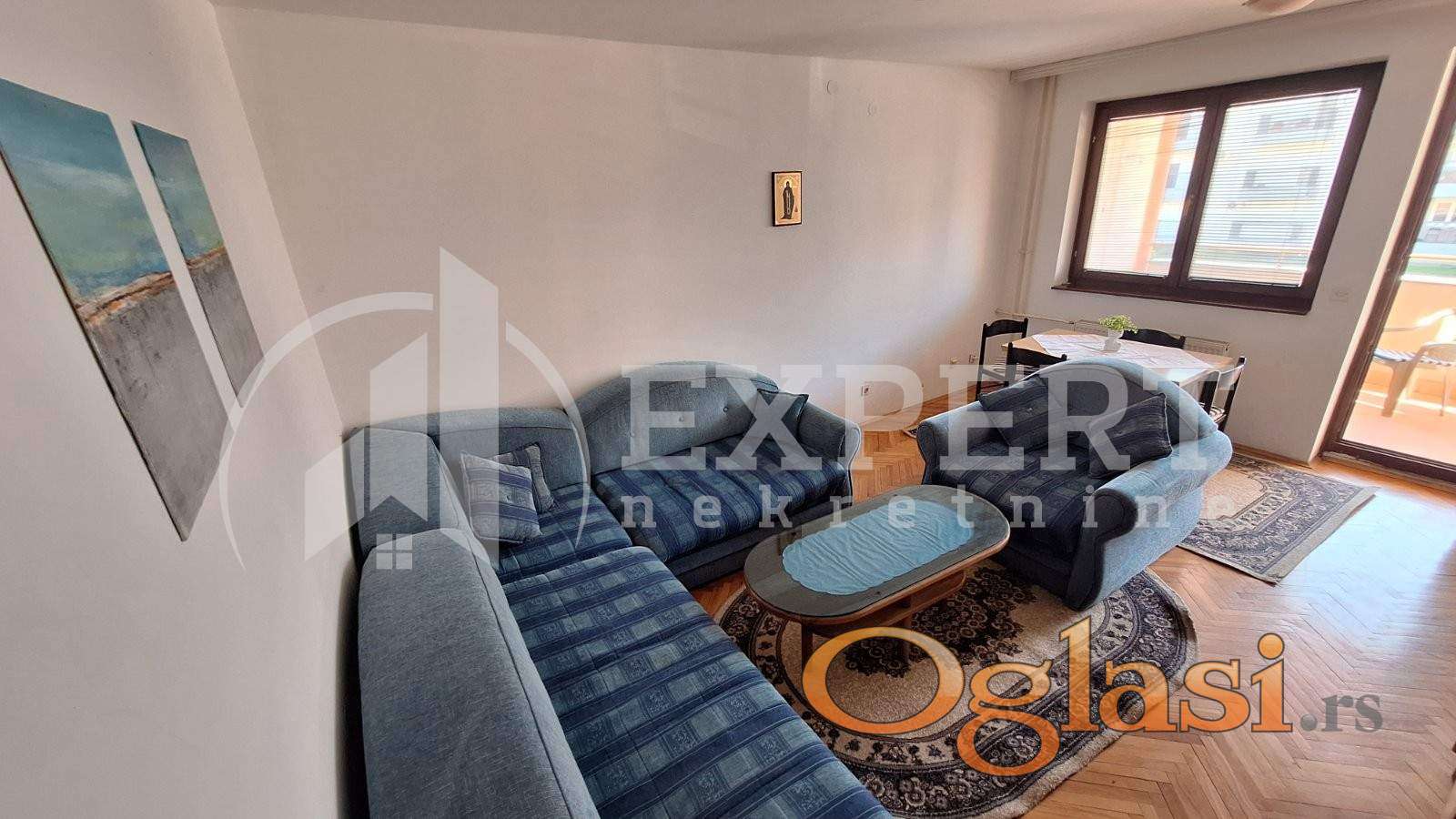Izdaje se stan površine 65m2 na prvom spratu u zgradi bez lifta. Sastoji se od ulaznog hodnika, trpezarije sa kuhinjom, dnevne sobe, dve spavaće sobe, kupatila i terase. Grejanje je centralno. Komplet je opremljen nameštajem i svom potrebnom belom tehnikom. Lepo je osvetljen i orijentisan. Izdaje se ozbiljnim zakupcima na duži vremenski period. Obavezan depozit u visini jedne mesečne kirije.