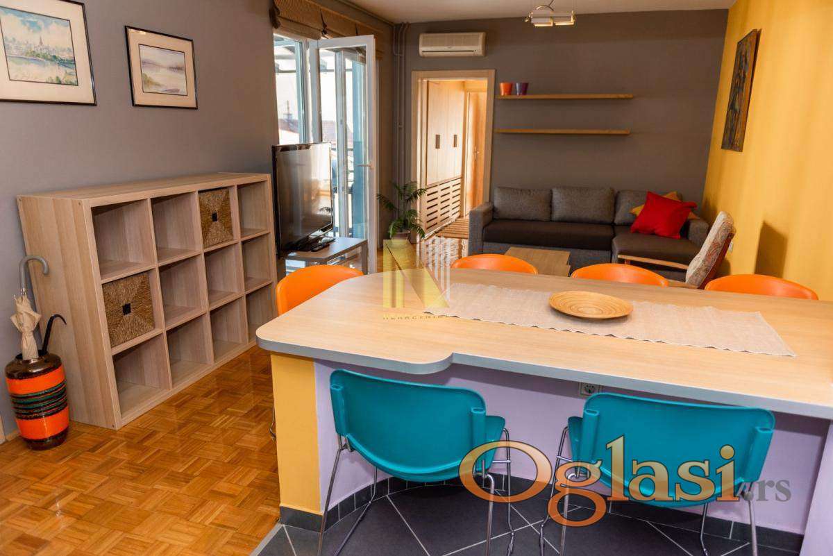 Komplet kuhinja, dve spavaće sobe, dnevna soba, trpezarija i dve terase.
