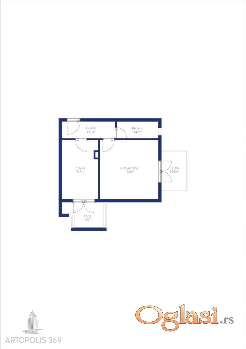 Ulazni hodnik, kuhinja sa trpezarijom, lodja, kupatilo, dnevna soba i terasa.