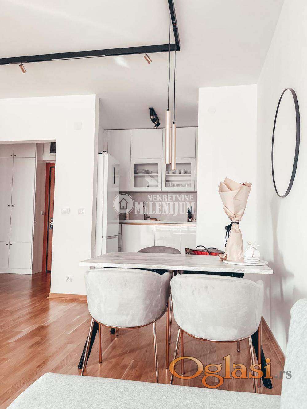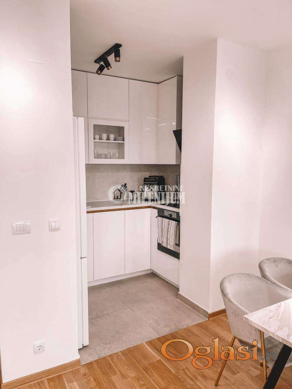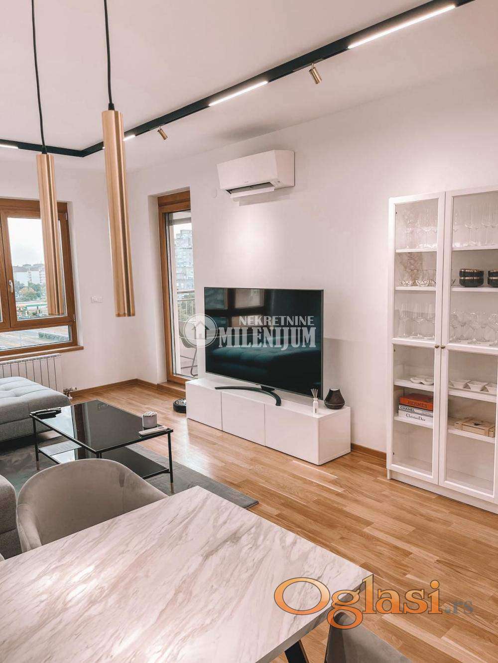 Stan je kompletno opremljen kvalitetnim i modernim nameštajem, pažljivo biranim kako bi prostor bio funkcionalan i estetski vrlo prijatan.
