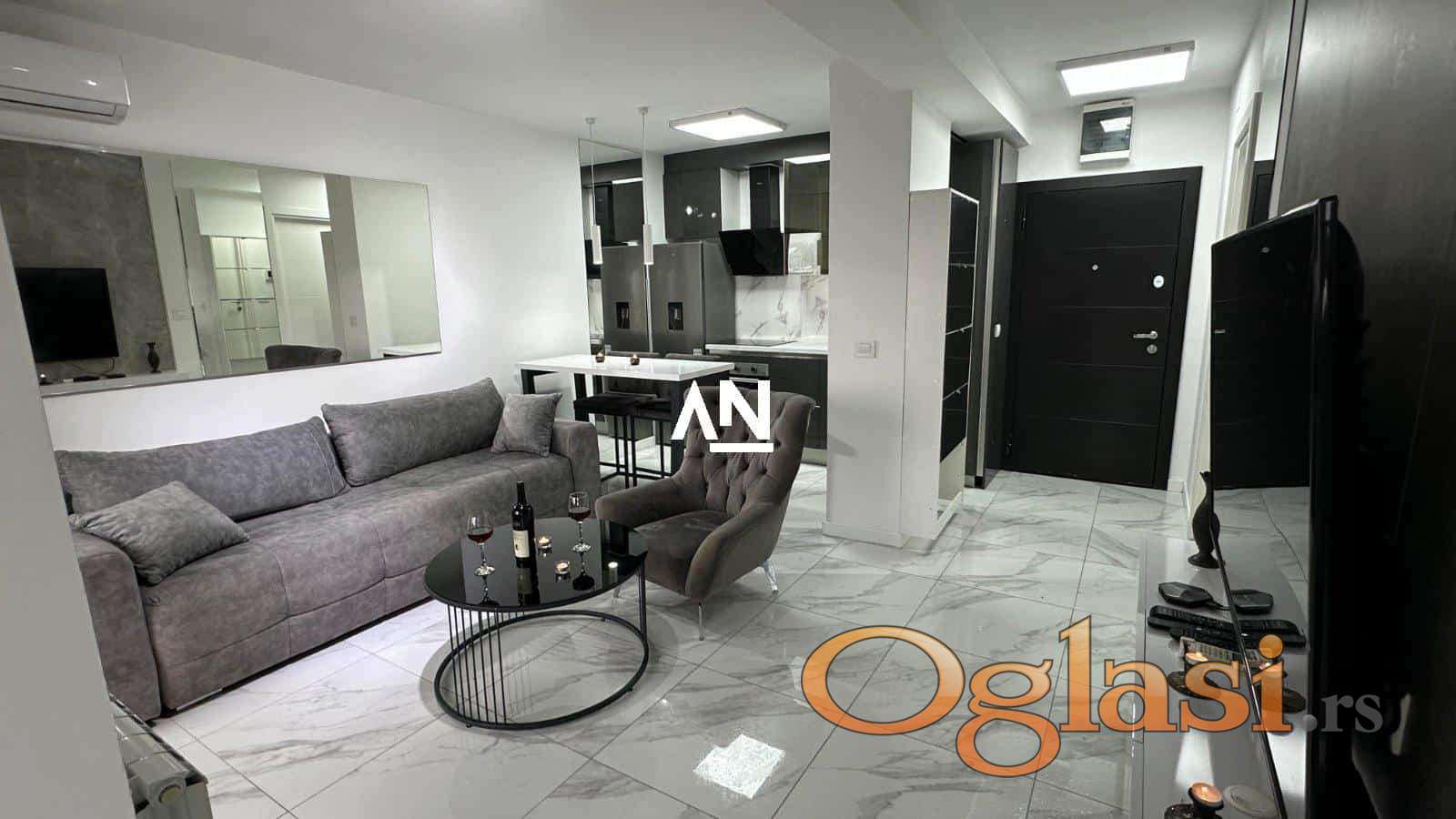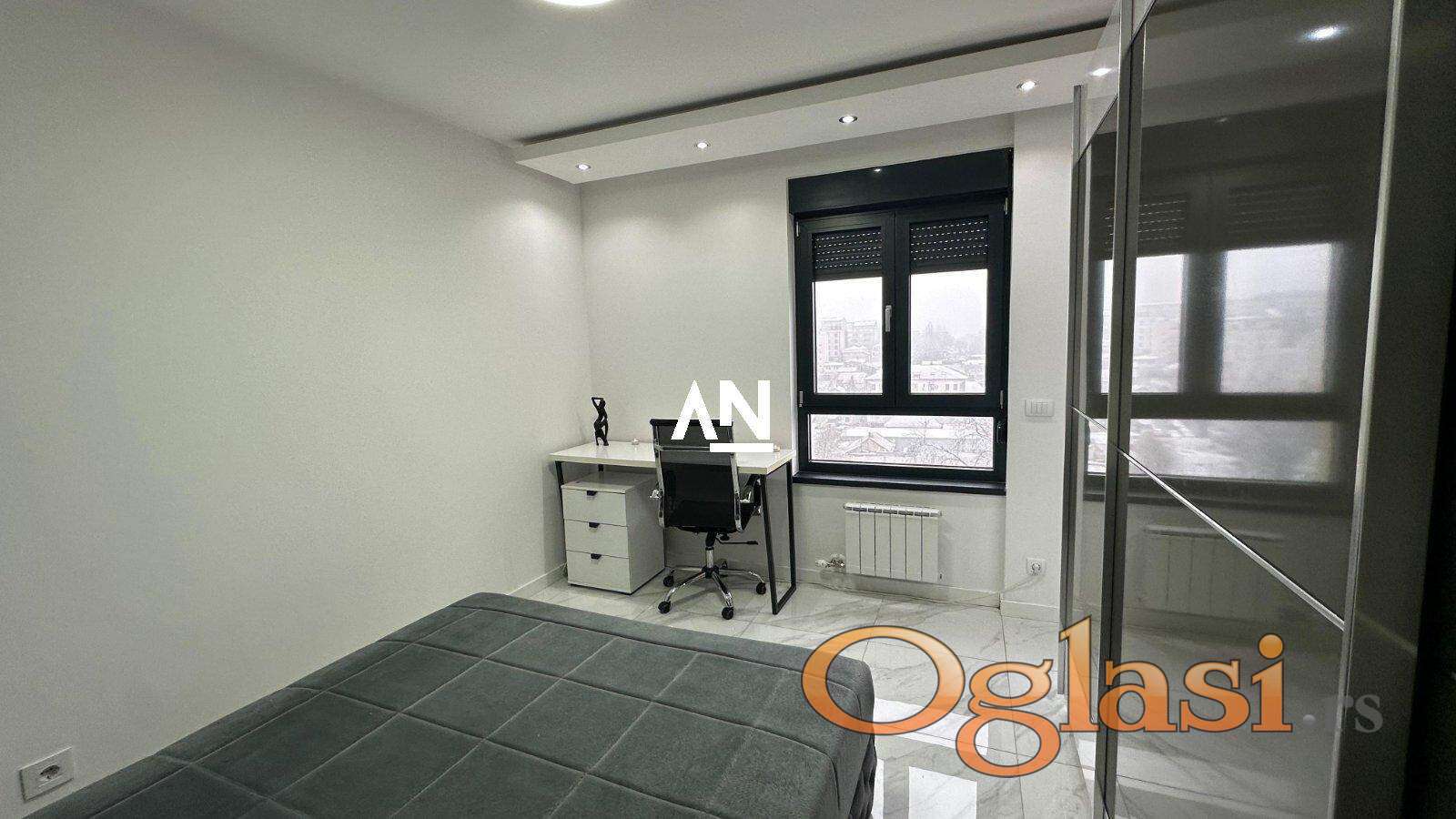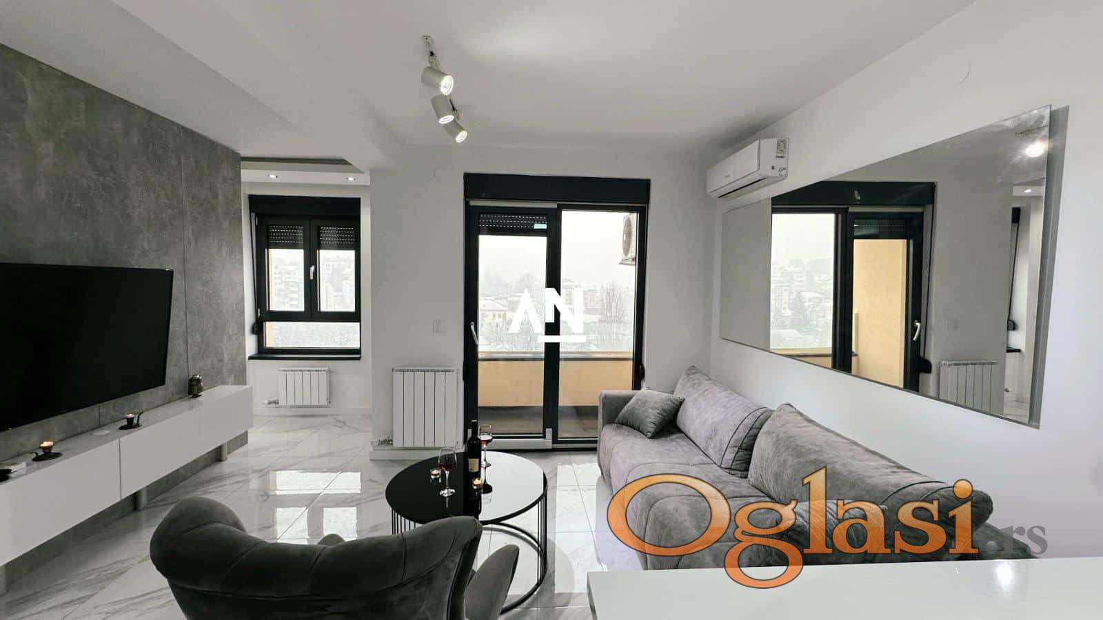 U luksuznoj zgradi novije gradnje, u srcu grada ali u mirnom okruženju, izdaje se potpuno opremljen stan modernog i sofisticiranog dizajna.