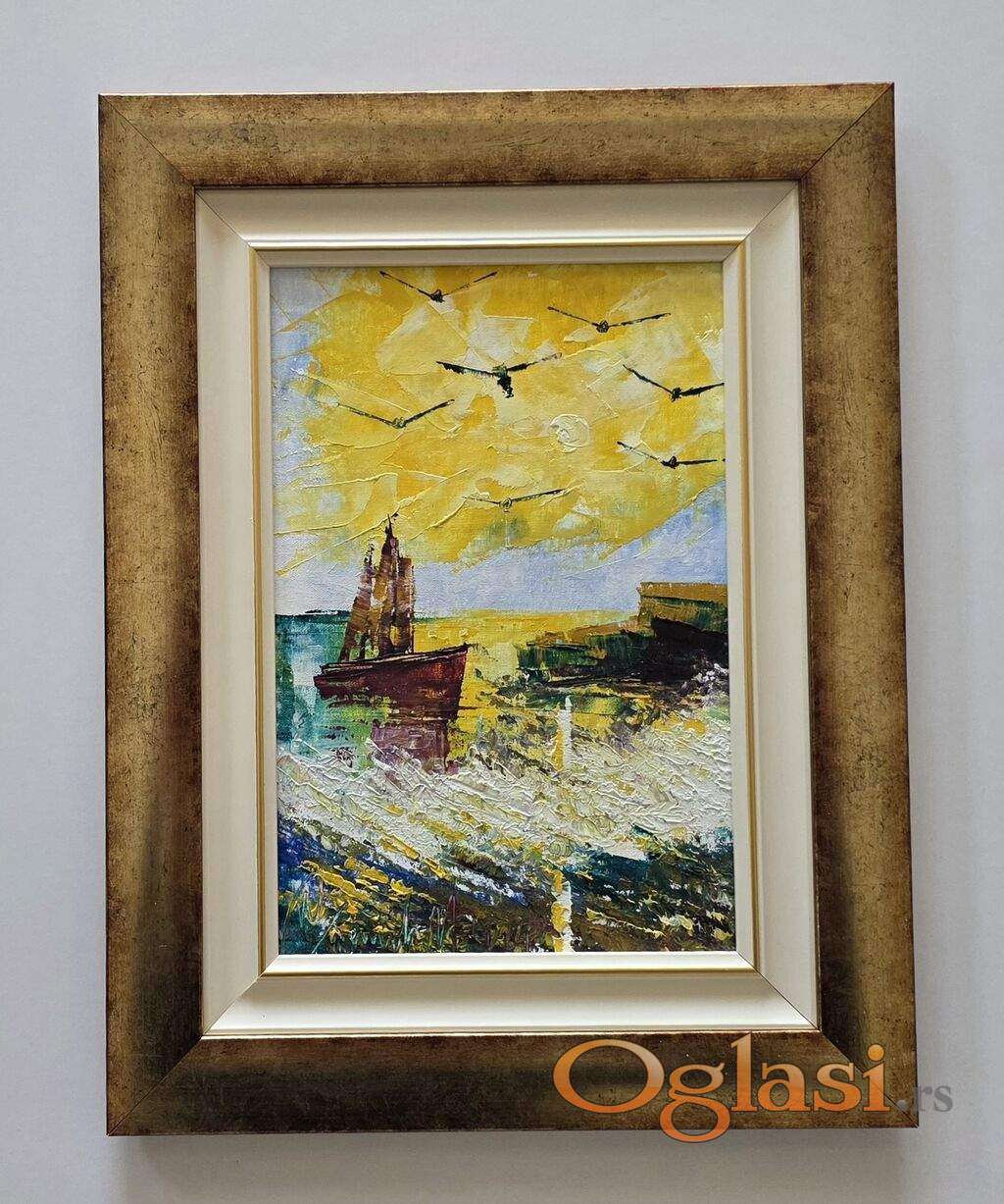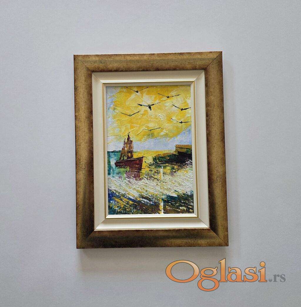 Ulje na platnu Povratak broda, prelepo umetnicko delo. Slika je uramljena u jako lep ram, dimenzije slike sa ramom 44 x 34. Privatna kolekcija.