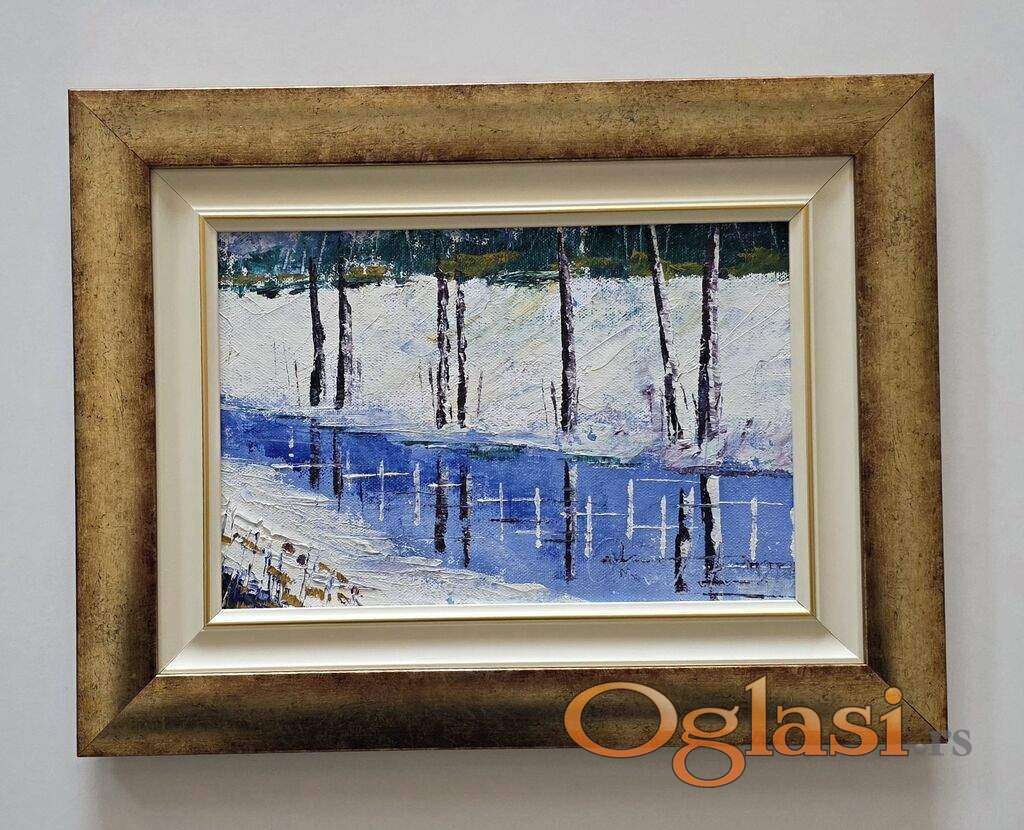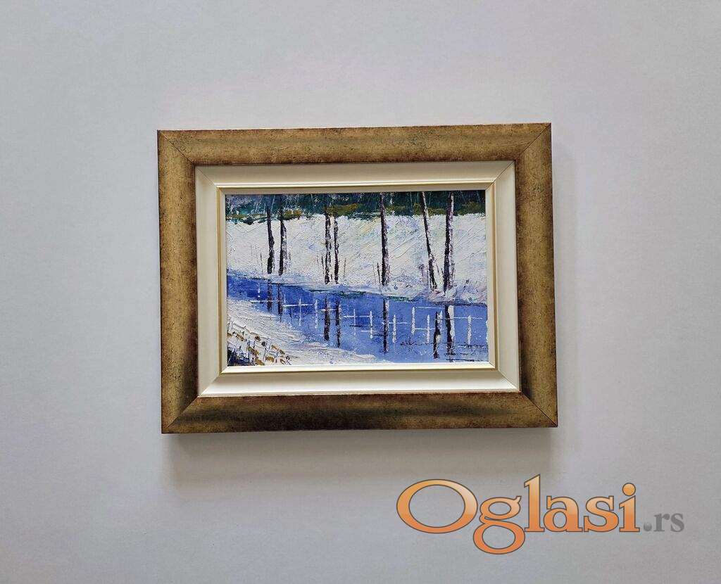 Ulje na platnu Plavi zimski mir, prelepo umetnicko delo. Slika je uramljena u jako lep ram, dimenzije slike sa ramom 44 x 34. Privatna kolekcija.
