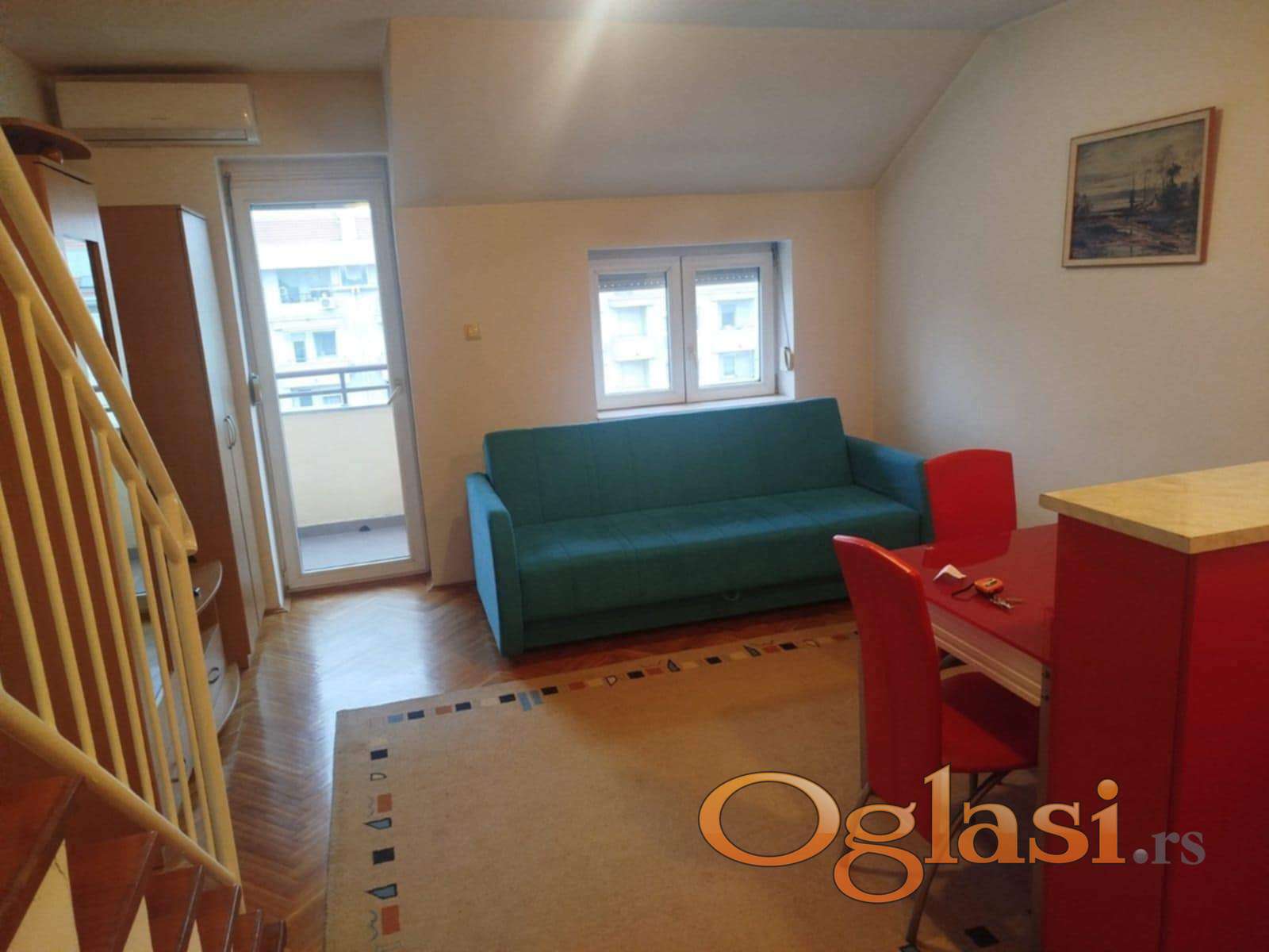 Potpuno namesten jednoiposobni duplex stan,terasa i stan gledaju na bulevar.Nalazi se na 4 spratu,grejanje je na gas,znaci placa se samo u sezoni.Poseduje inverter klimu tako da u slucaju nestasice gasa moze da se greje na struju.Iza zgrade se nalazi parking na koji se ulazi kroz rampu za koju se dobije kod.Stan je idealan za par bez dece zbog stepenica koje idu u sobu na spratu.