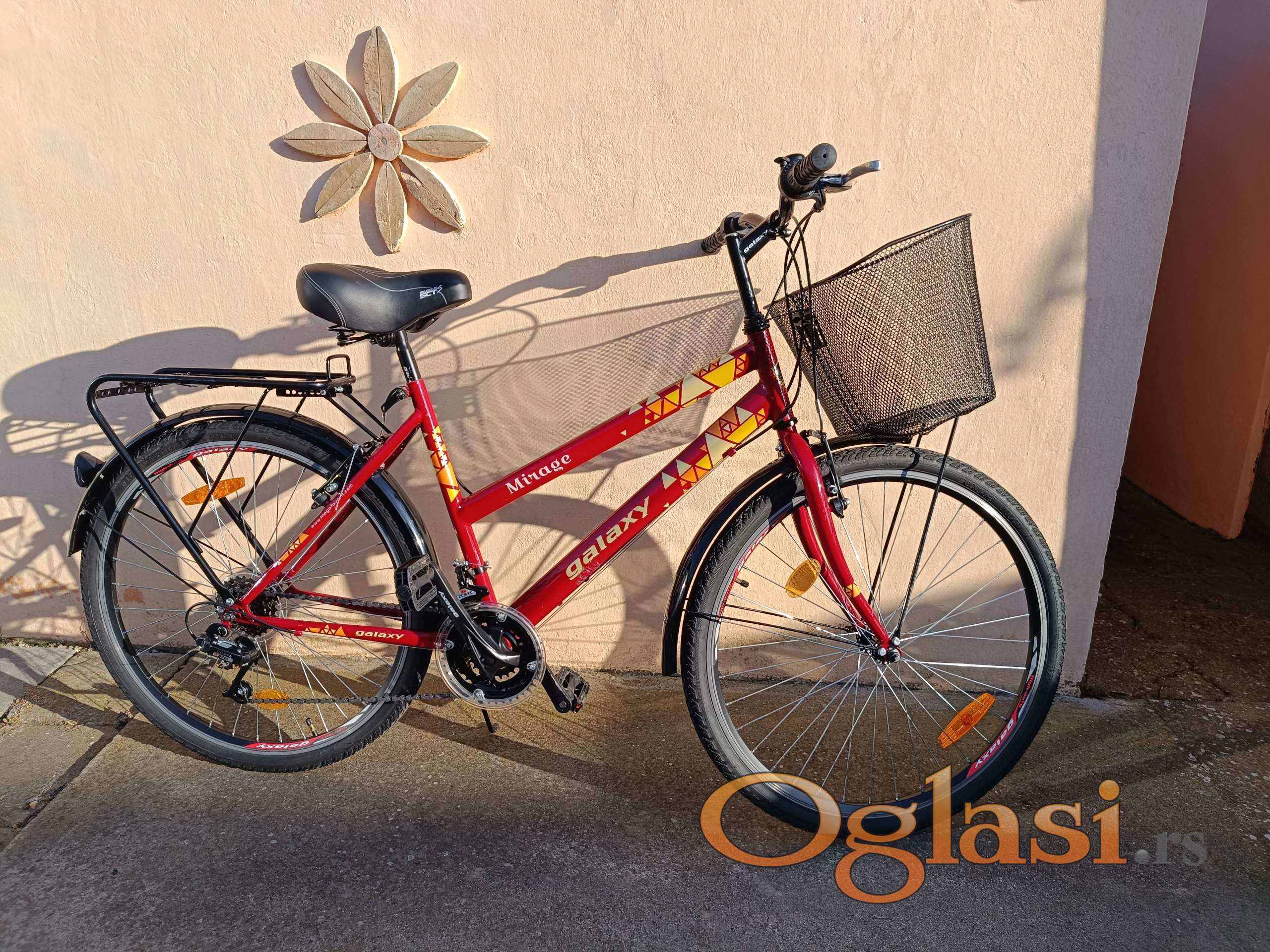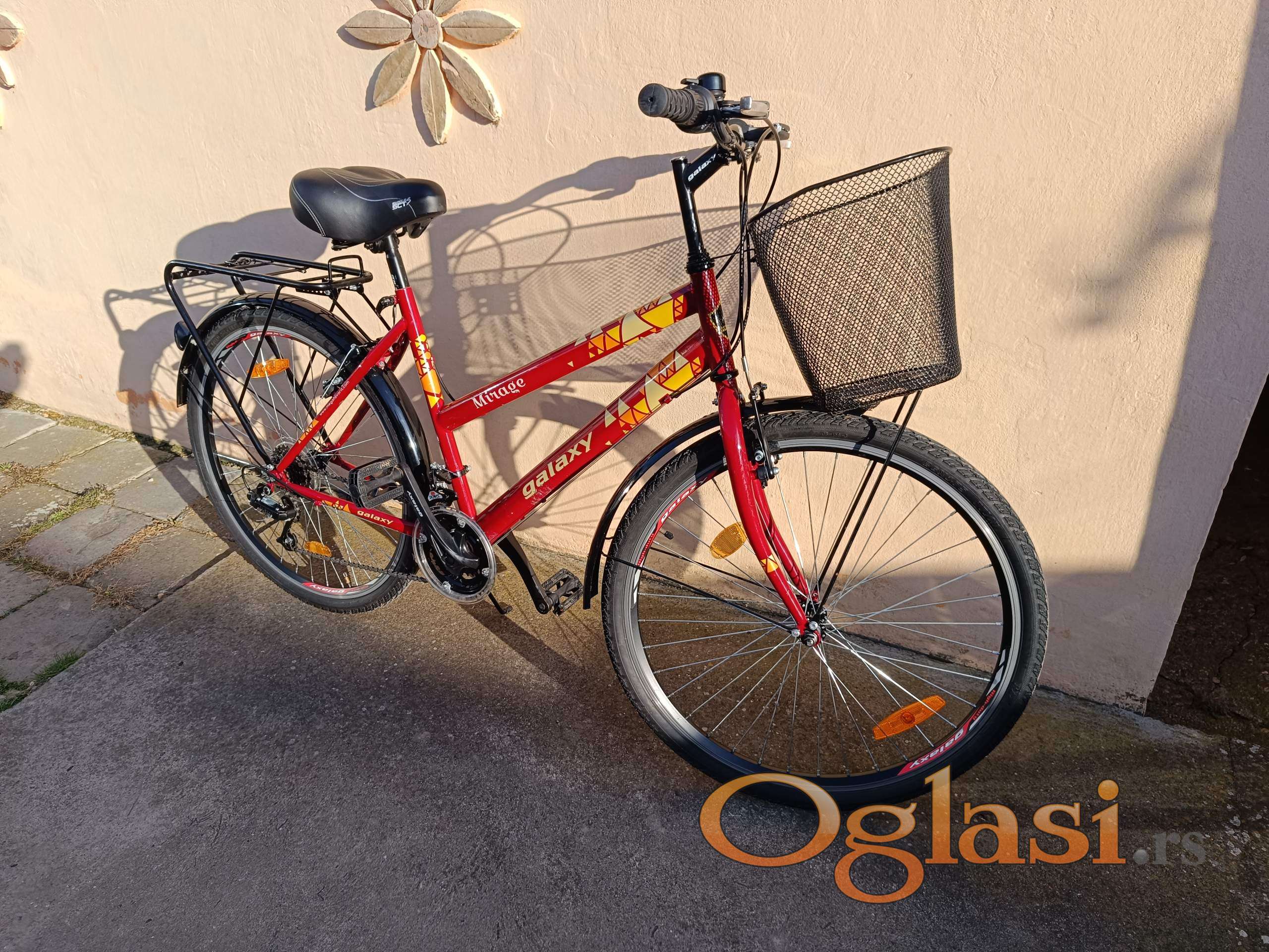 Galaxy Mirage 26 zensko biciklo sa 18 brzina,korpa,paktreger,duplozidne ojacane felne.Biciklo je kao novo,potpuno ispravno i spremno za voznju.
