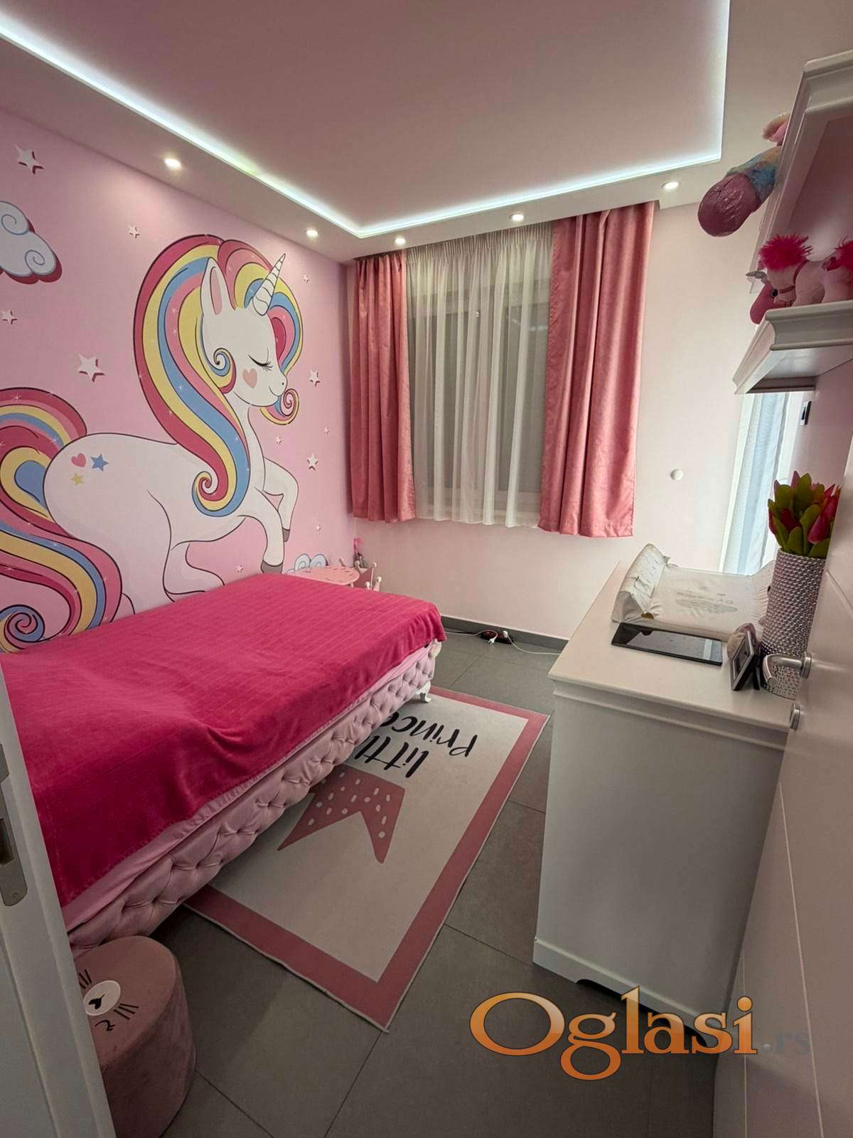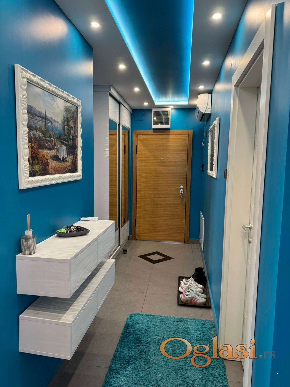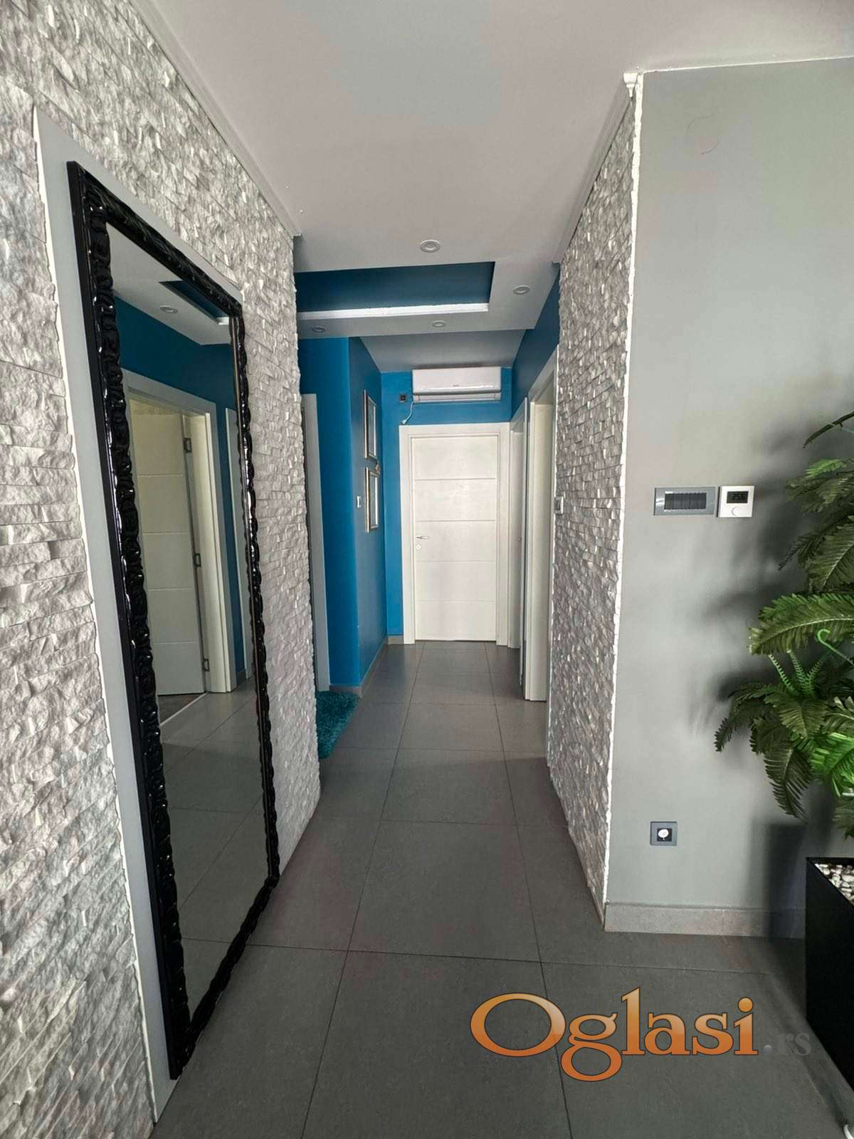 Enterijer je moderno uređen sa spuštenim plafonima i LED rasvetom, dok su u celom stanu postavljene granitne keramičke pločice. Grejanje je podno na gas sa kalorimetrom, što omogućava merenje potrošnje i veću energetsku efikasnost.