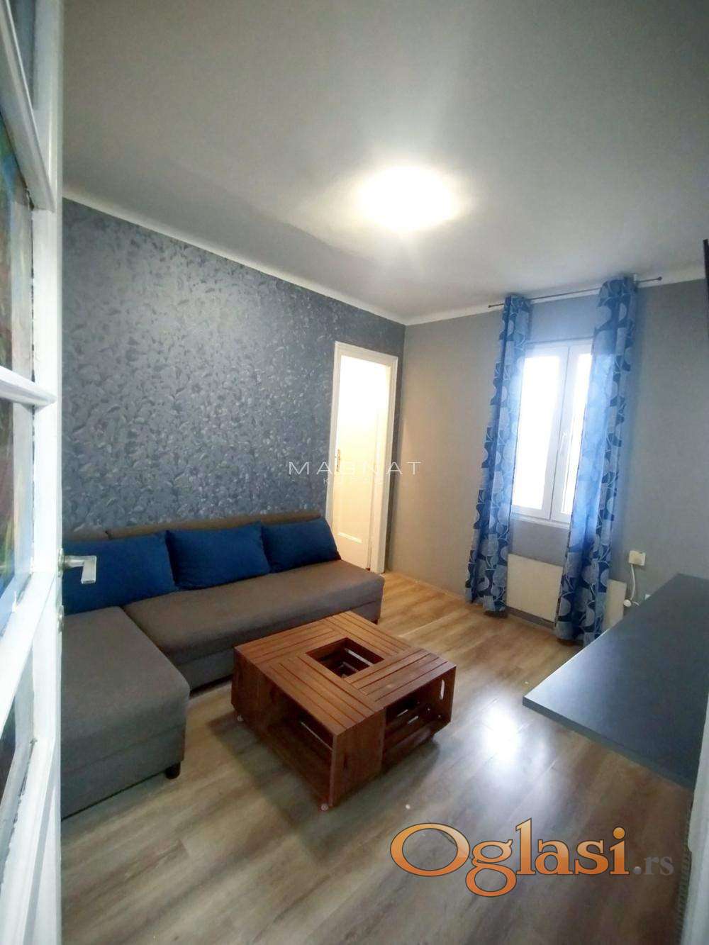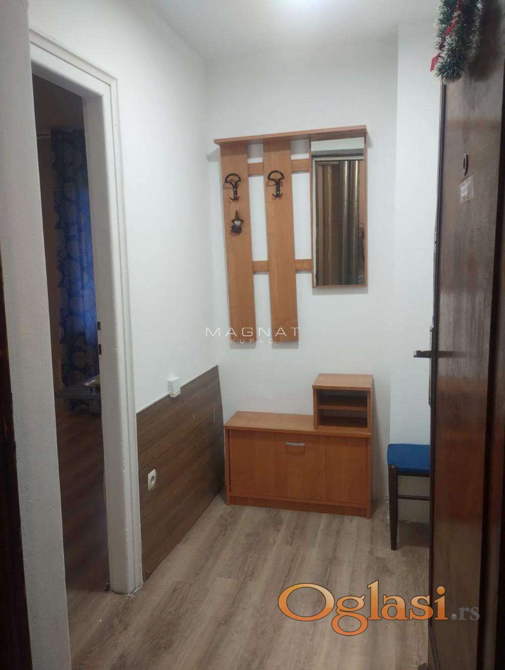 Stan je sveže okrečen i delimično renoviran: novi dušek (160×200), lakirani podovi, nova radna površina u kuhinji, ofarbana vrata. Opremljen veš mašinom, mašinom za sudove, TV-om i nameštajem. Ugaona garnitura na razvlačenje.