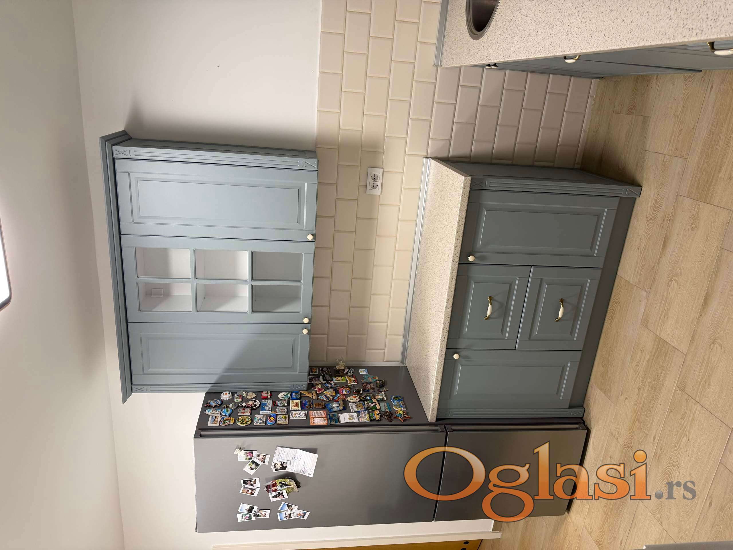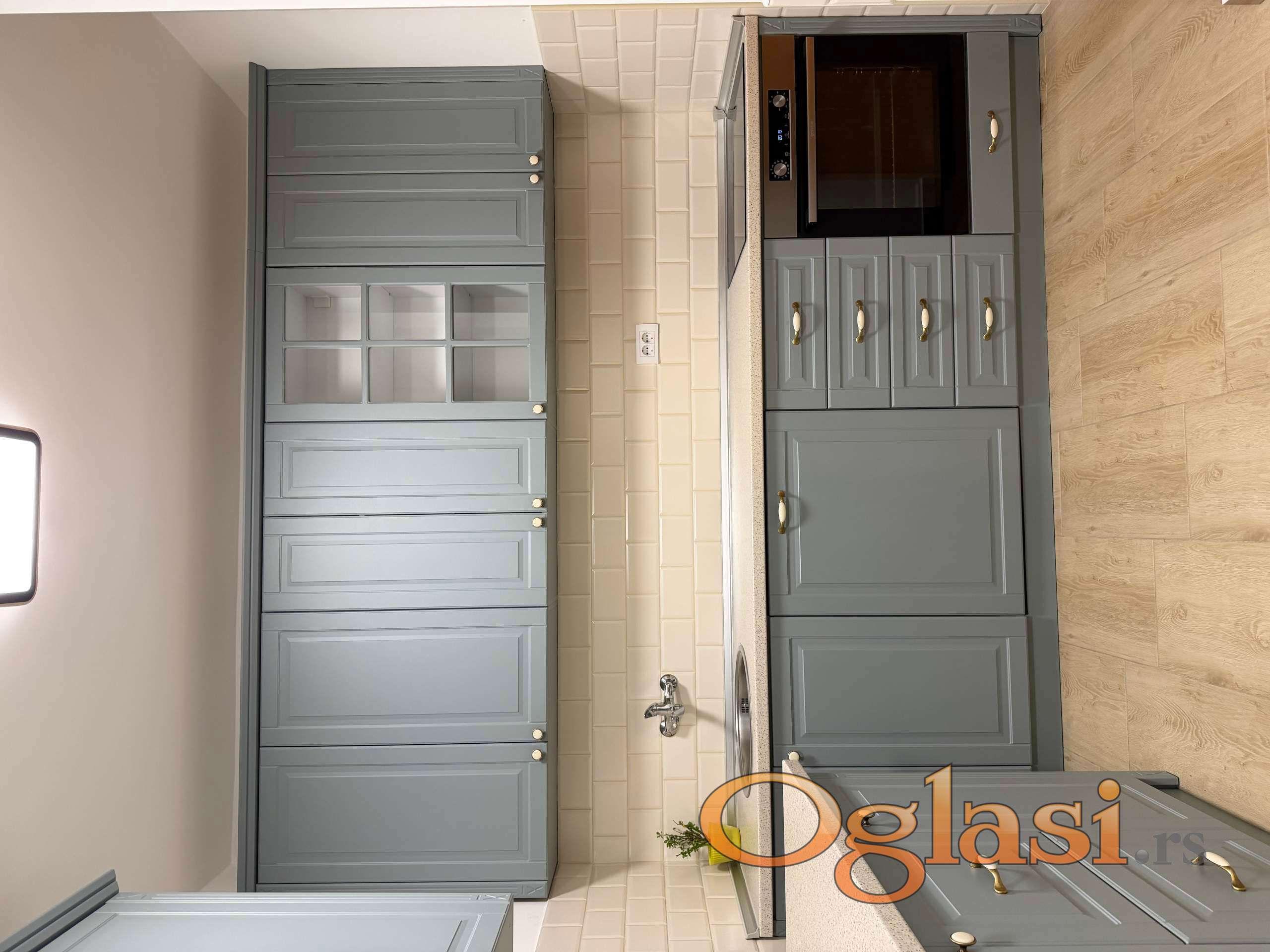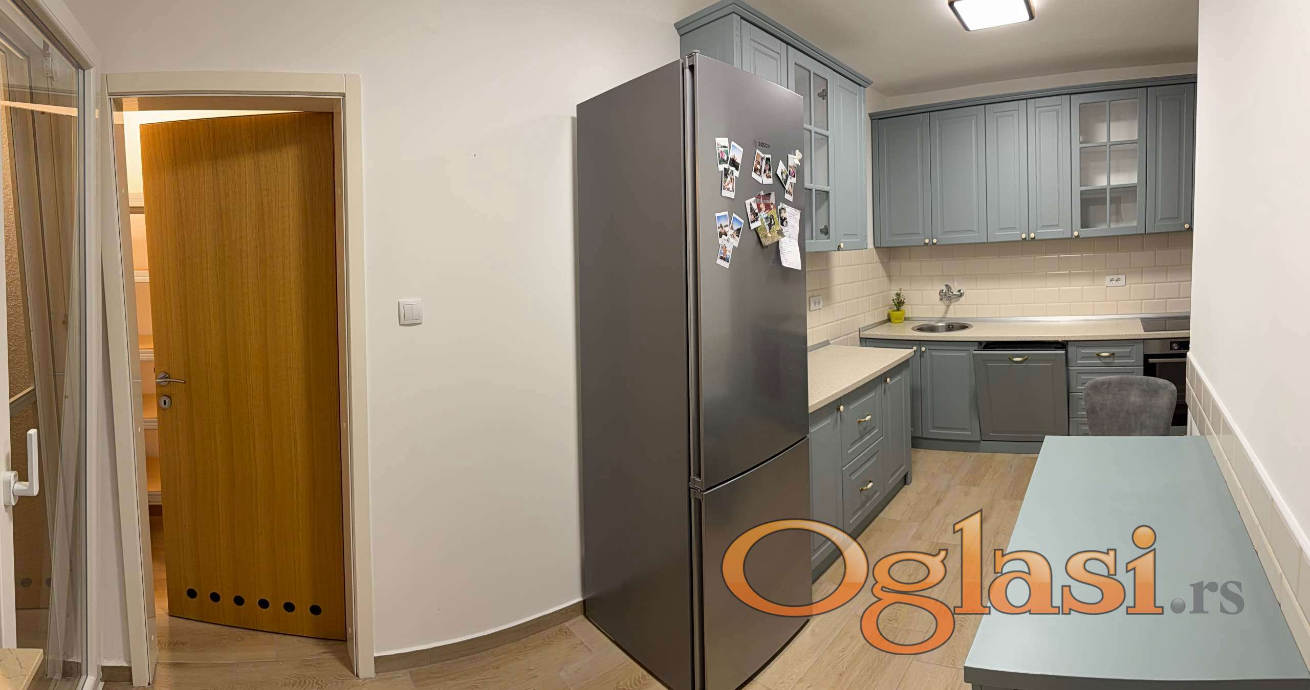 Kuhinja je opremljena sa najkalitetnijim uredjajima koji su i dalje u garanciji. Izuzetno funkcionalan, pravljena od medijapana. Indukciona ploca za kuvanje, multifunkcionalana rerna, masina za sudove, sudopera, veliki Bosch kombinovani frizider.