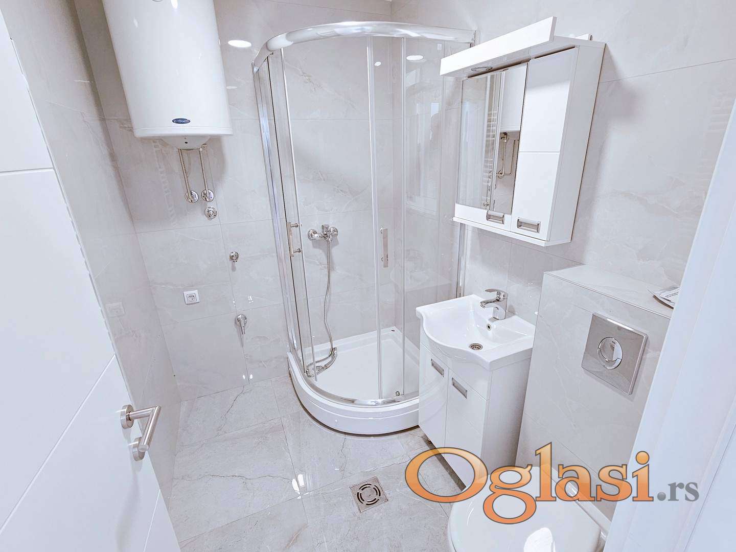 Kupatilo (ugradni konzolni vodokotlić, tuš kabine od kaljenog stakla, linijski slivnici, konzolna wc šolja, sušači za peškire);