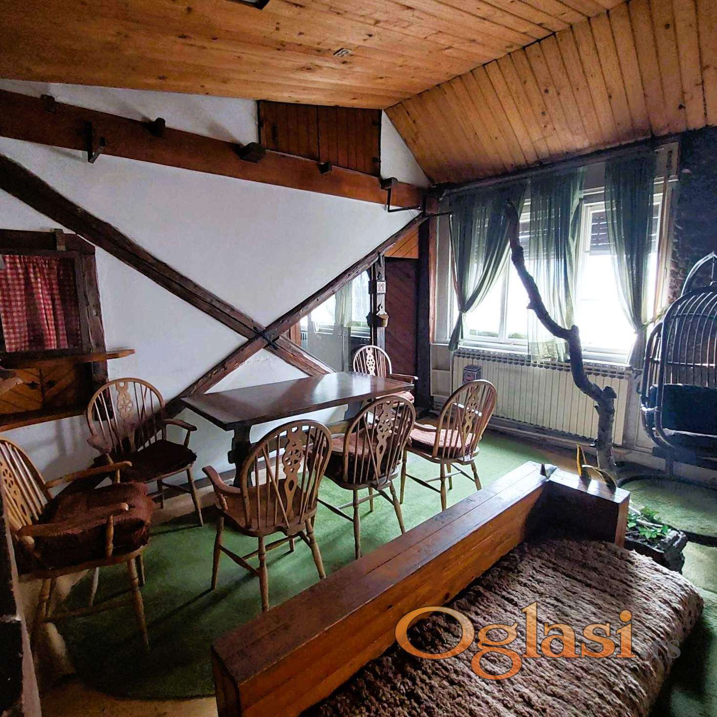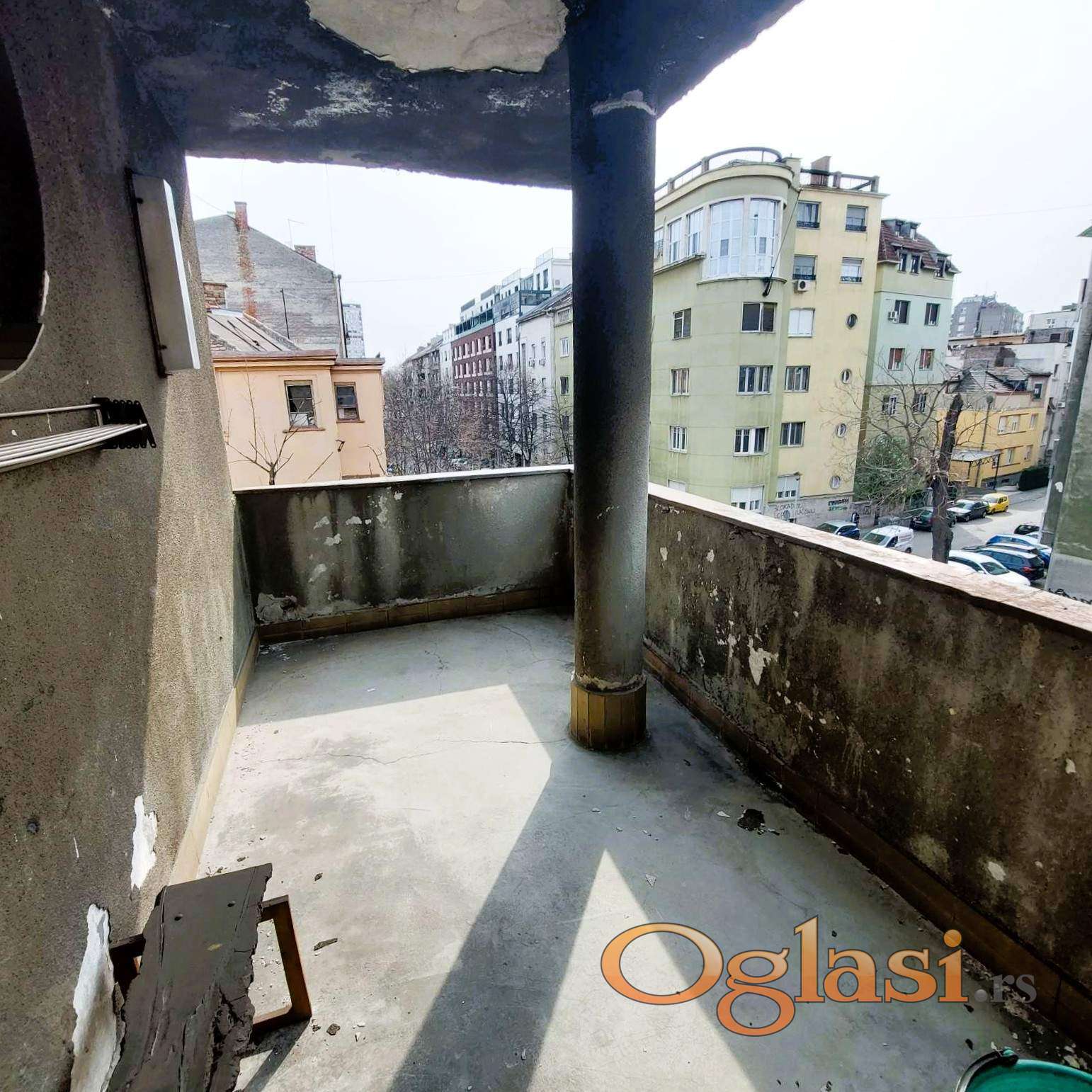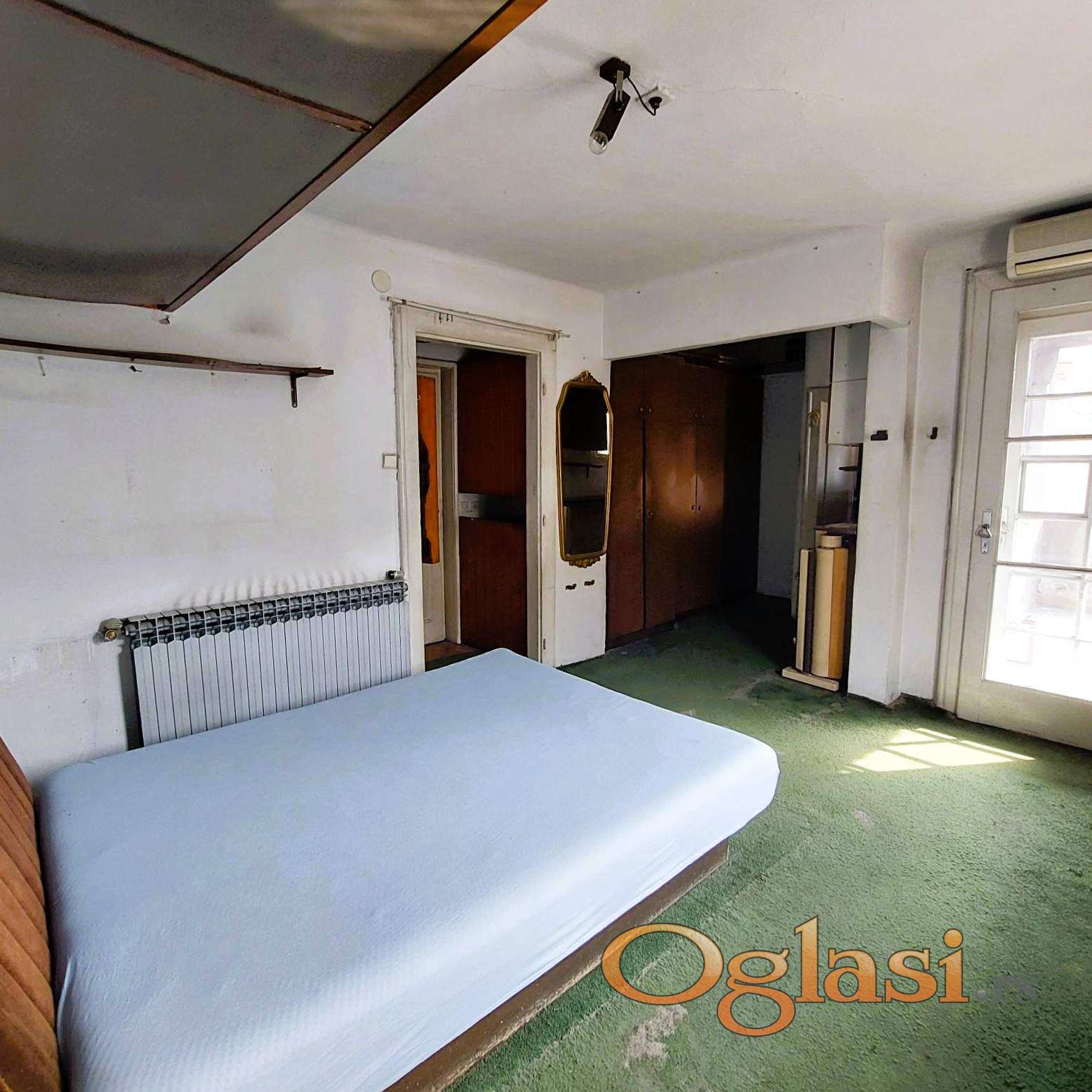 Zemun, Karađorđev trg, u mirnoj ulici Miroslava Tirša u ponudi trosoban stan uknjižen na 87m2, sa dve lođe ukupno 98m2. U potkrovlju, na trećem spratu od tri, salonske zgrade bez lifta, sa etažnim grejanjem. Sastoji se iz hodnika, dnevne sobe sa trpezarijom, mini kuhinje, dve sobe, tri mokra čvora, dve lođe. Umetnički je dizajniran u stilu osamdesetih godina i zahteva renoviranje. Dvostrano orijentisan sa dva ulaza pa nudi više mogućnosti za adaptaciju i moguće ga je podeliti na dva stana. Zgrada je starom jezgu Zemuna, u blizini dve osnovne škole, Poljoprivrednog fakulteta, doma zdravlja, prodavnica, restorana, na 300m od keja. Poseduje interfon i video nadzor.