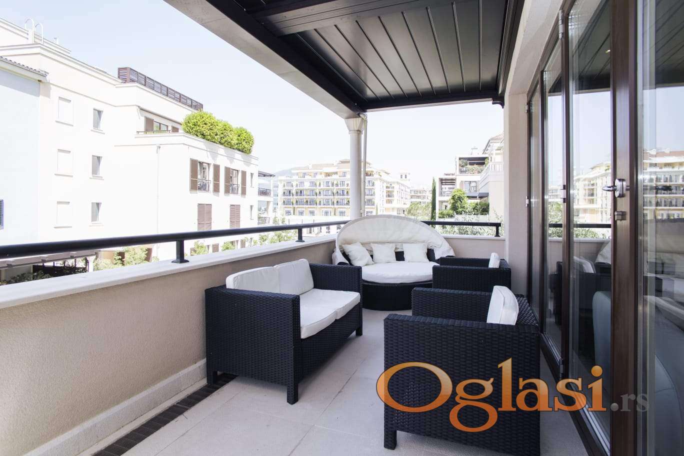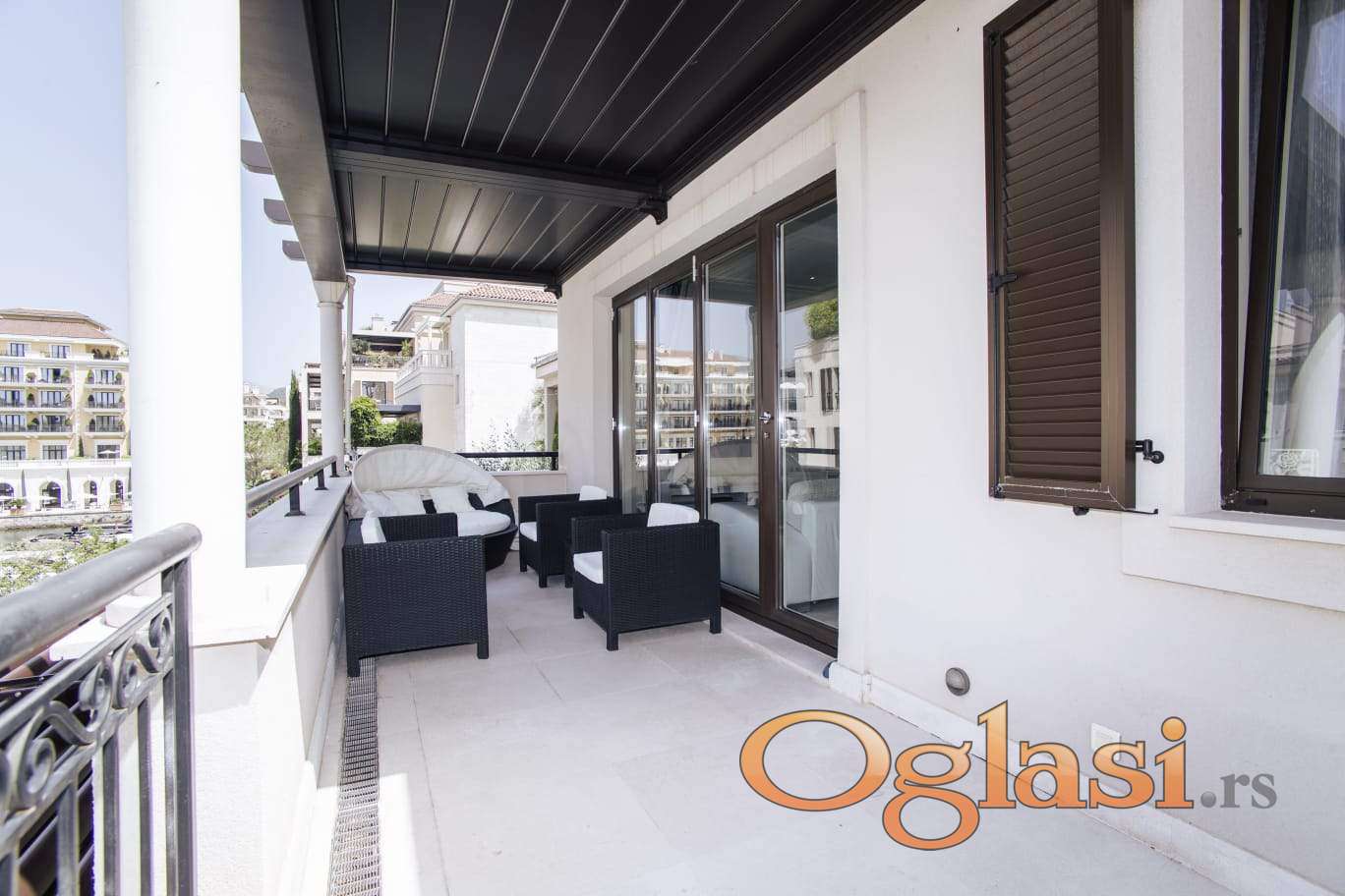 Sastoji se od dnevnog boravka s kuhinjom i blagovaonicom, spavaće sobe i kupaonice. Velika terasa nudi djelomičan pogled na more, šetnicu Porto Montenegro i 5-zvjezdični hotel Regent. Apartman je potpuno namješten i opremljen.